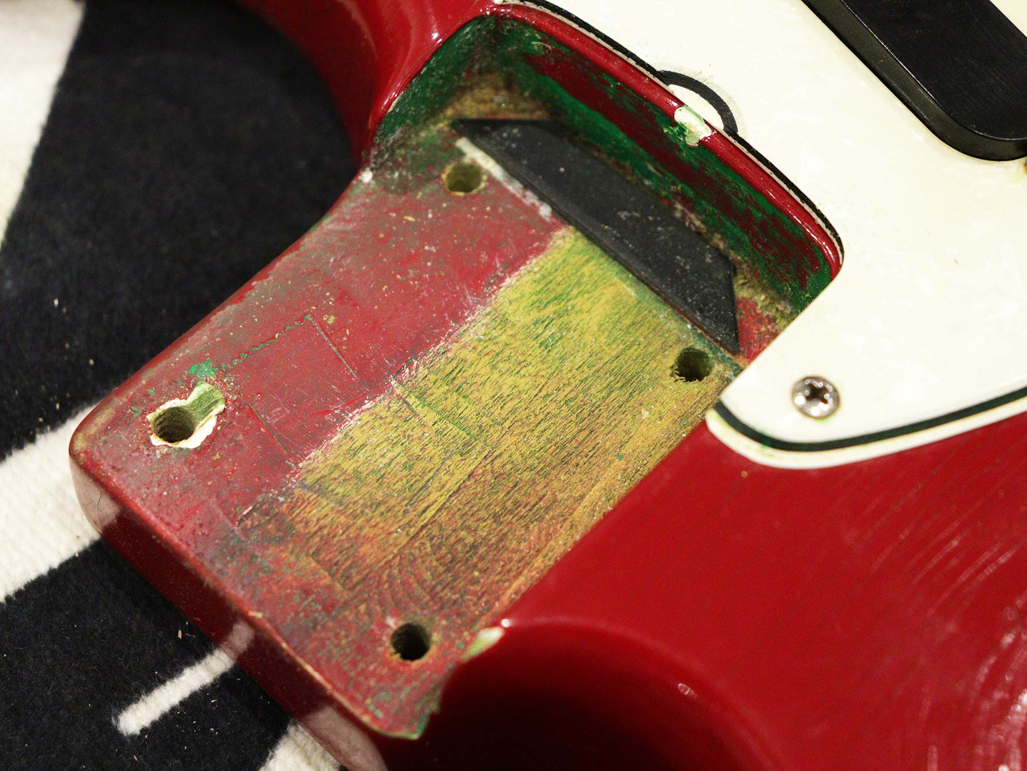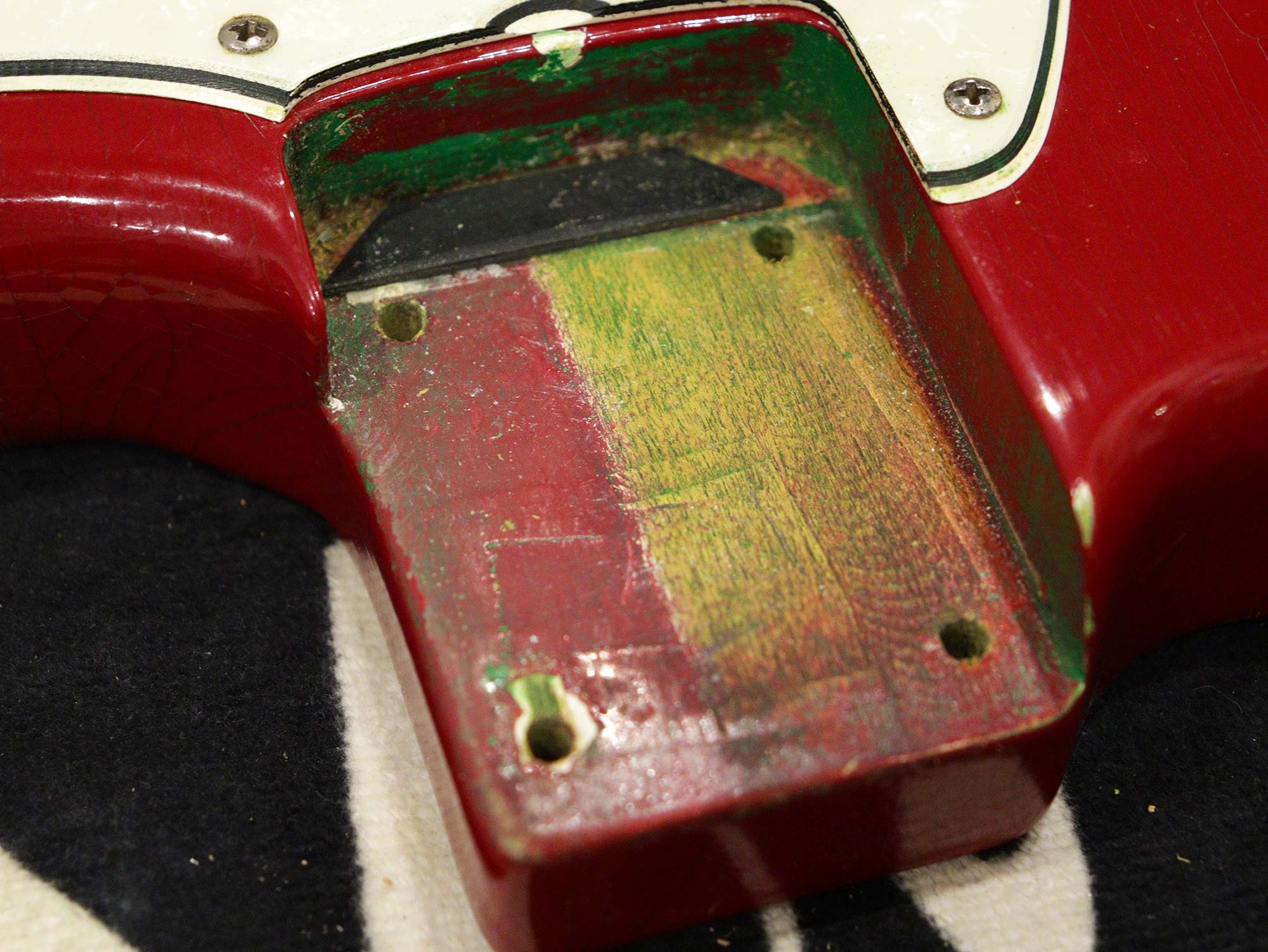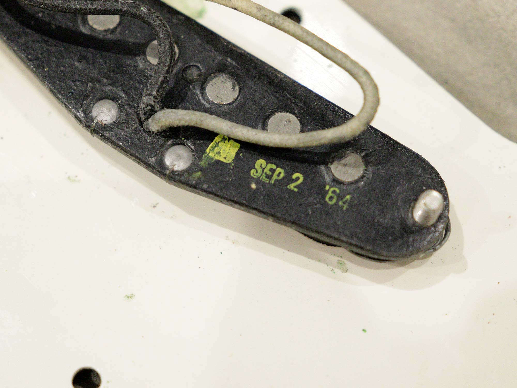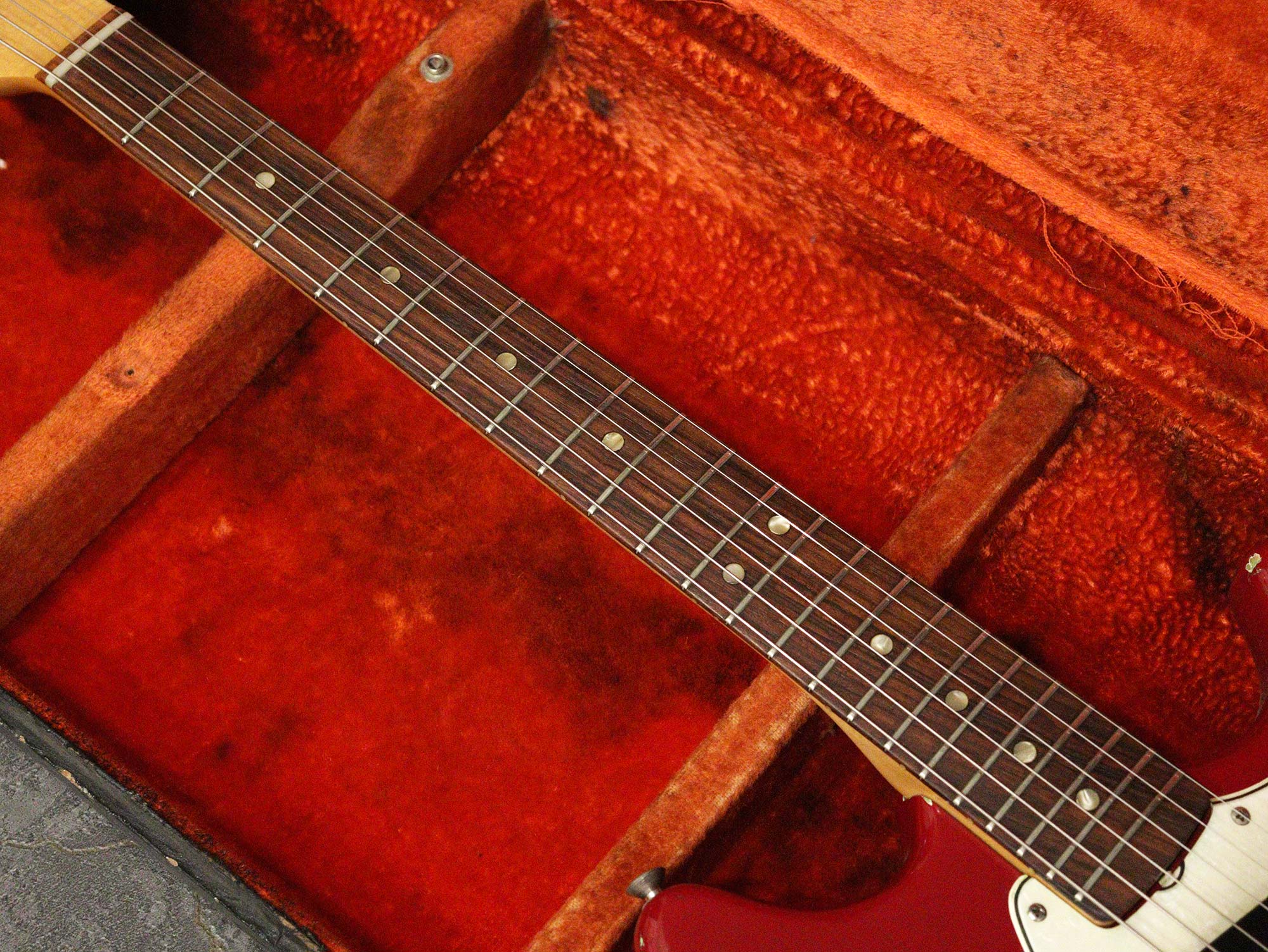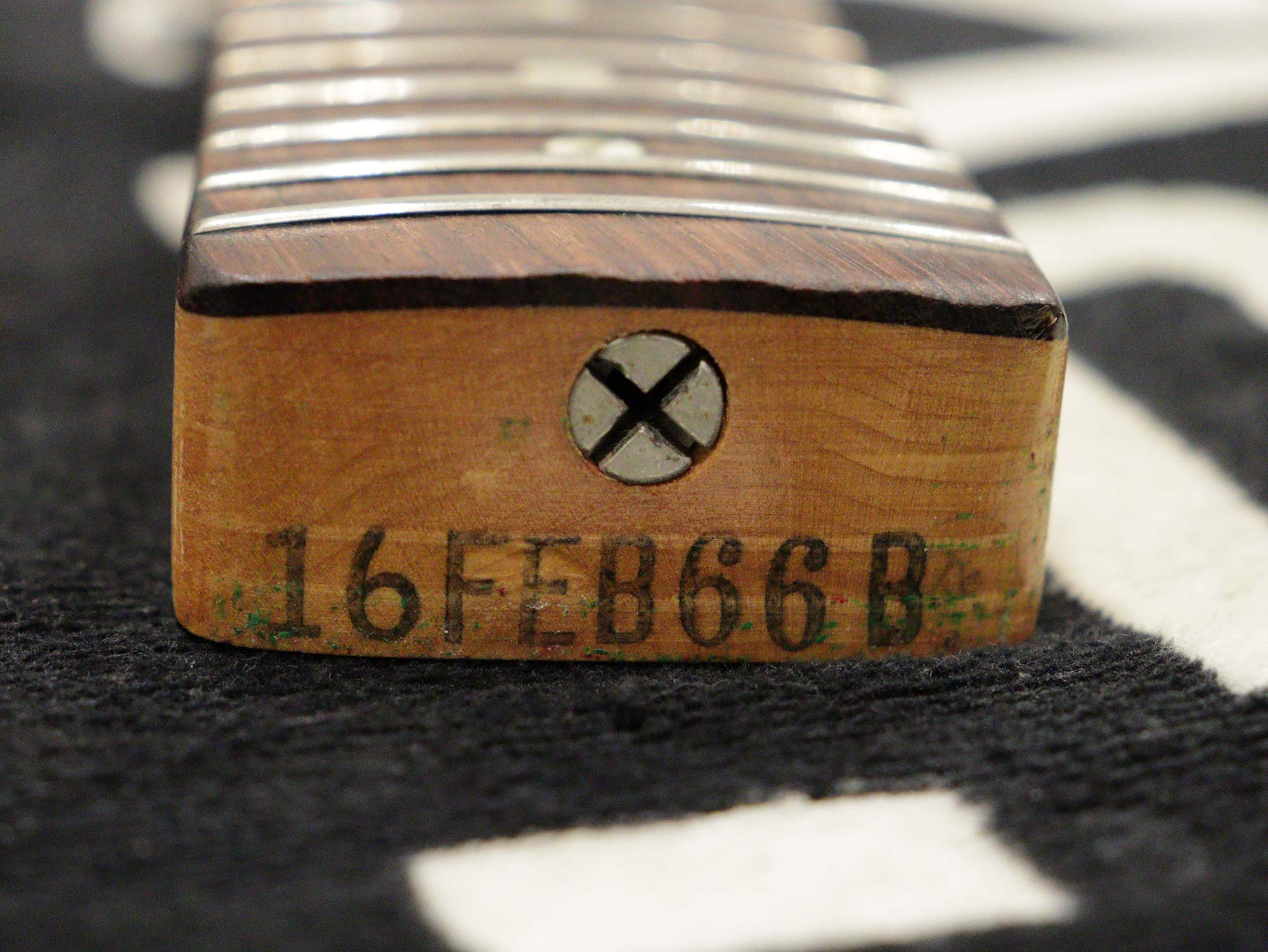 ナットは牛骨にて交換、アームが非純正、ネックは「1966年製 Bネック」、ピックアップは64スタンプありのブラックボビン(フロントが読みにくいですが恐らく64)、ポットは「66年製 CTS」、ブリッジは「PAT. PEND.」刻印入りダイナミック・ヴィブラート搭載。