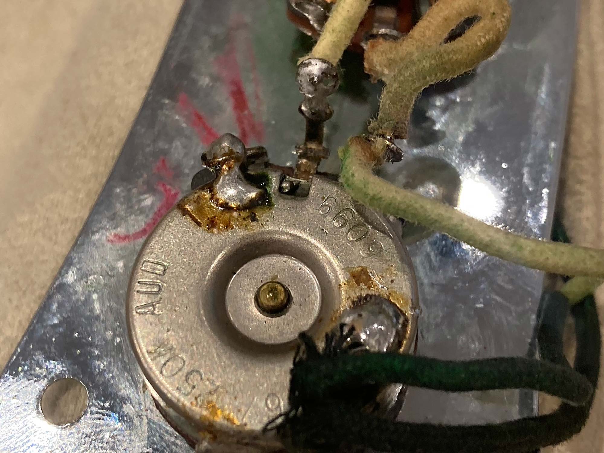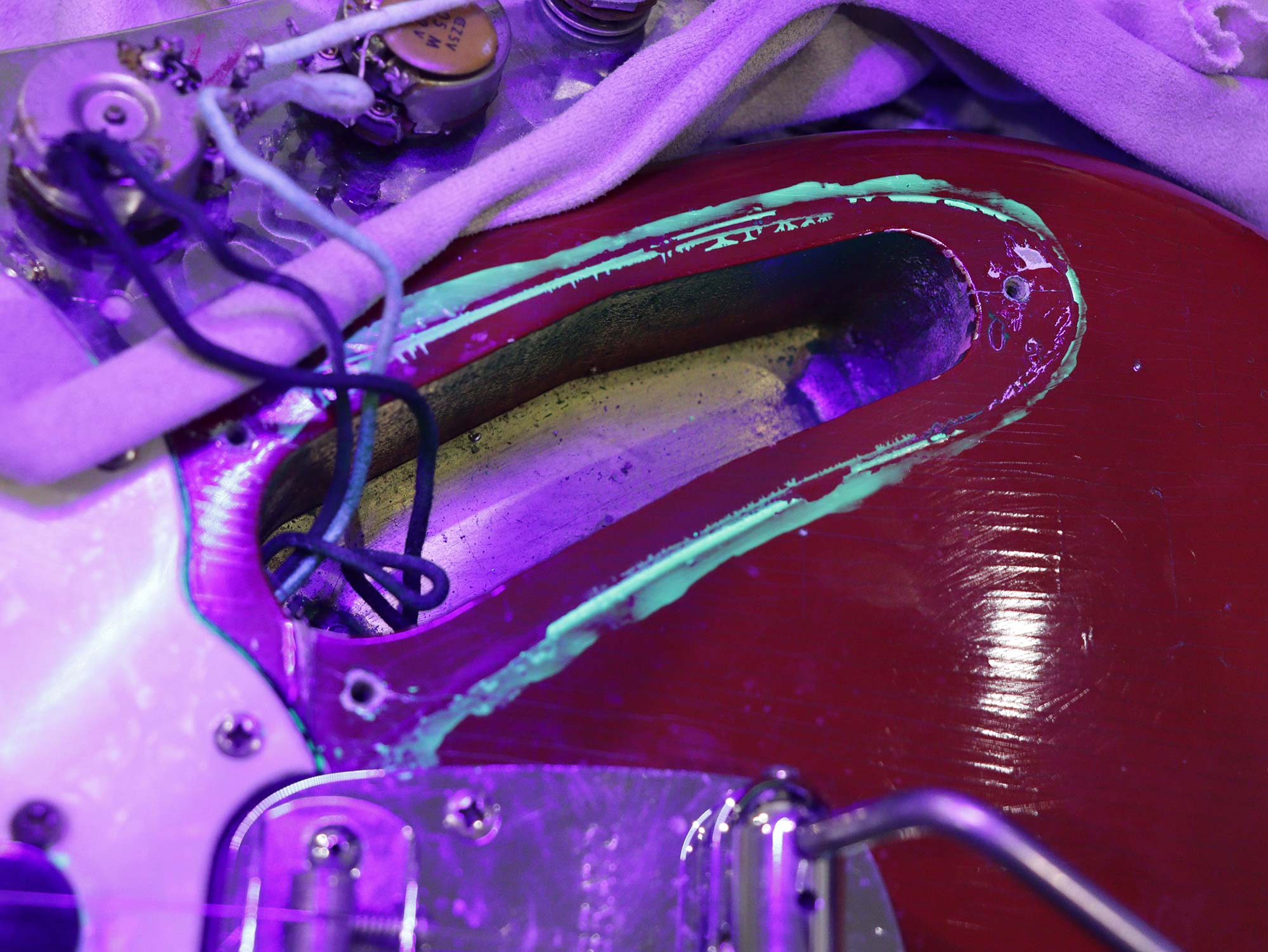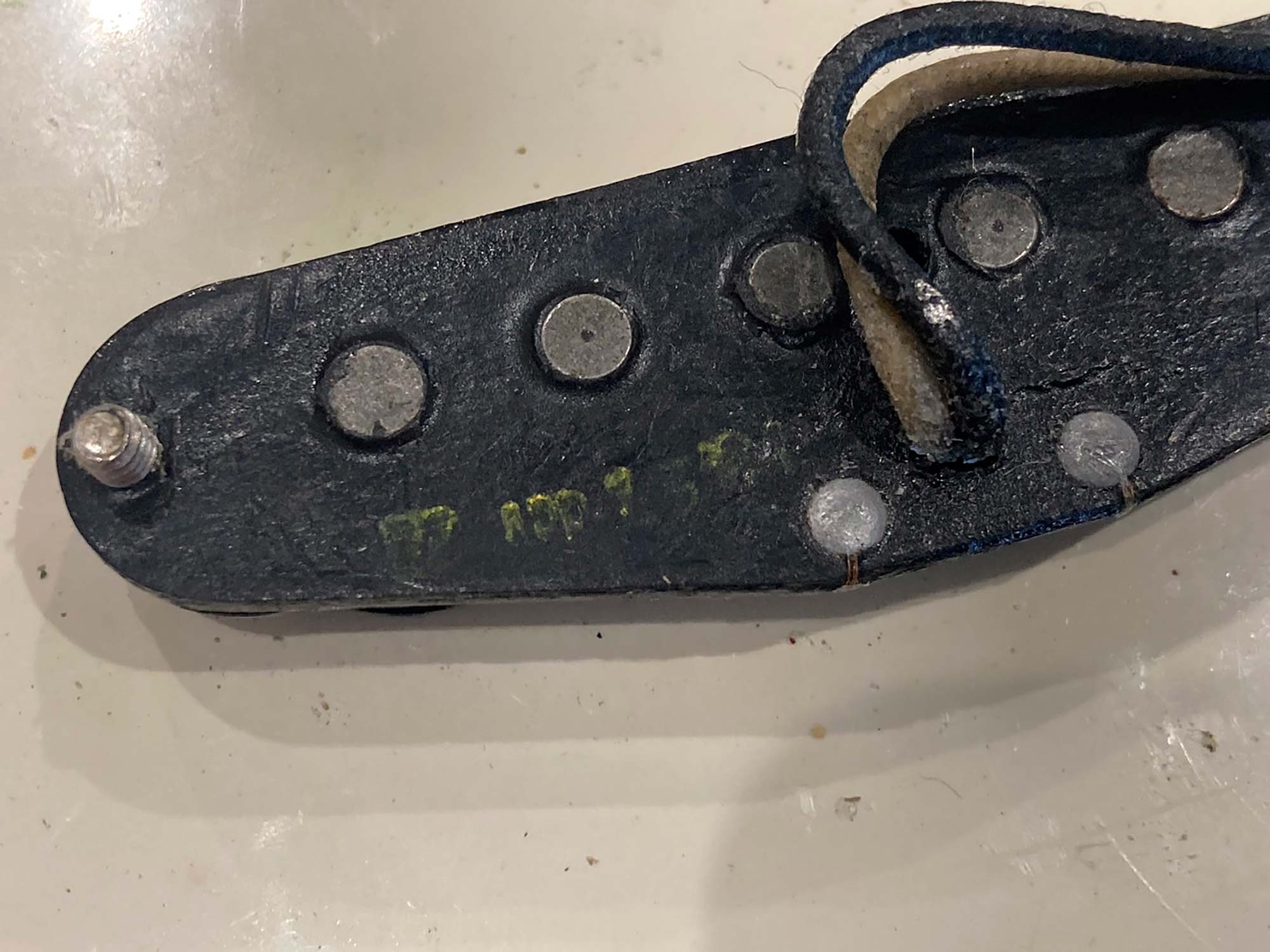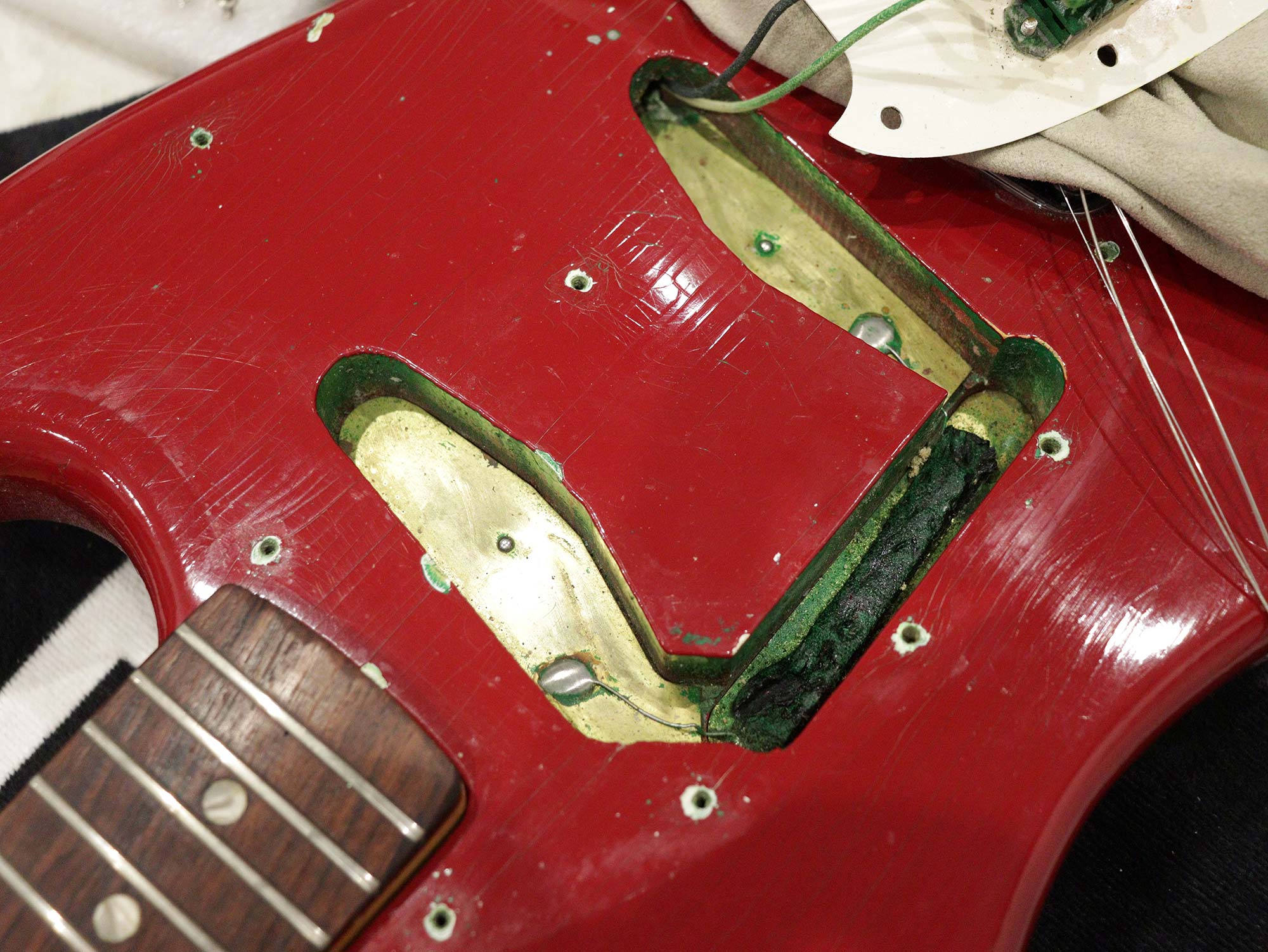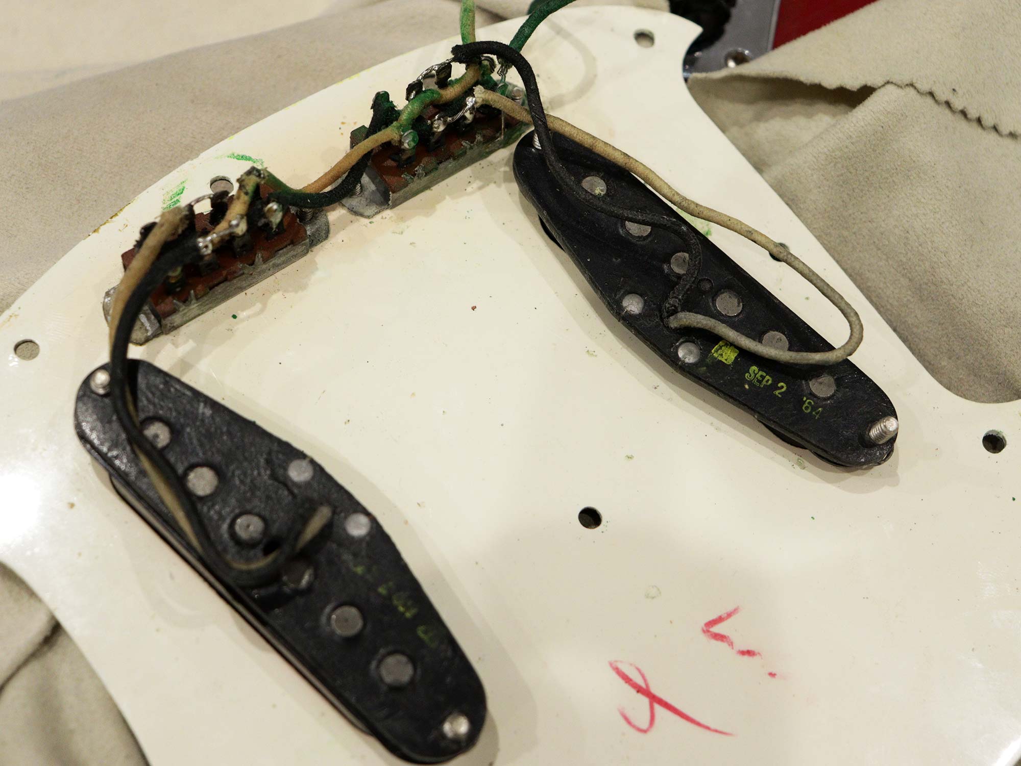 ナットは牛骨にて交換、アームが非純正、ネックは「1966年製 Bネック」、ピックアップは64スタンプありのブラックボビン(フロントが読みにくいですが恐らく64)、ポットは「66年製 CTS」、ブリッジは「PAT. PEND.」刻印入りダイナミック・ヴィブラート搭載。