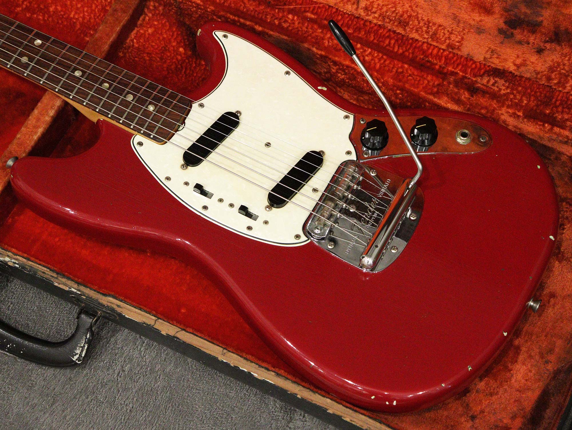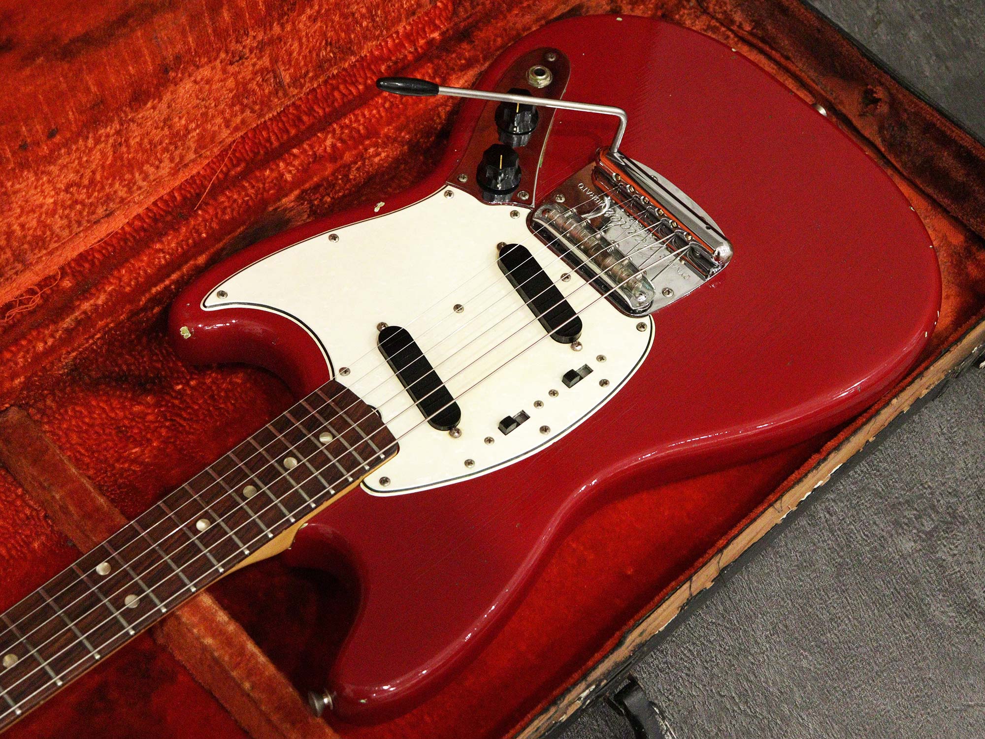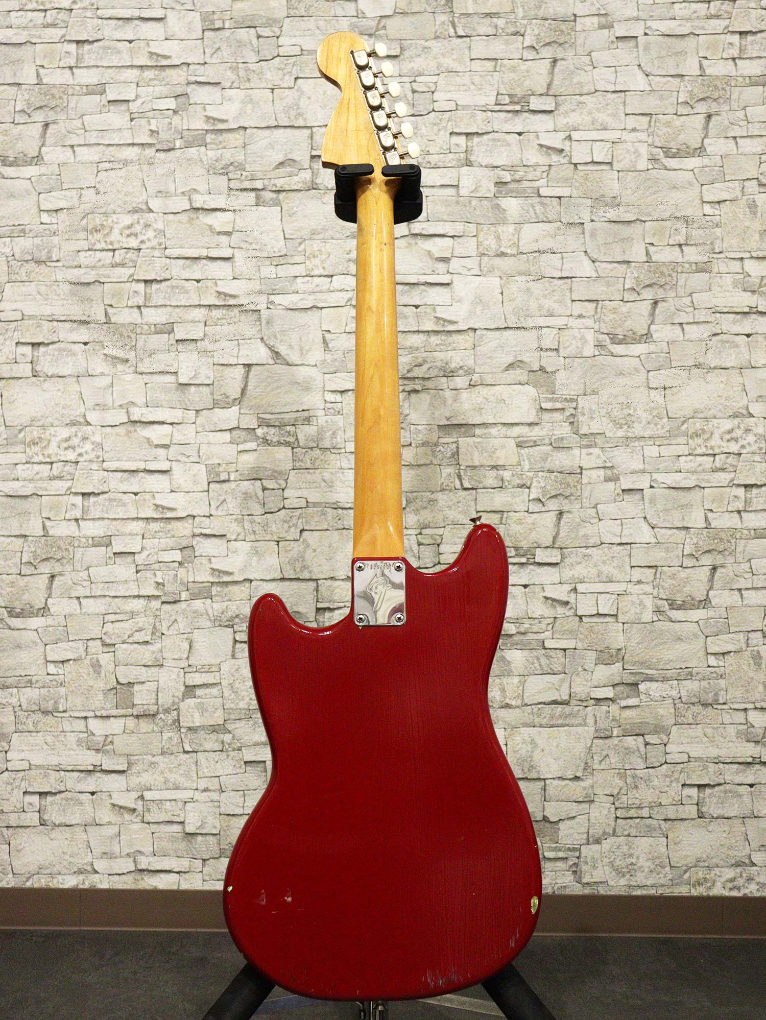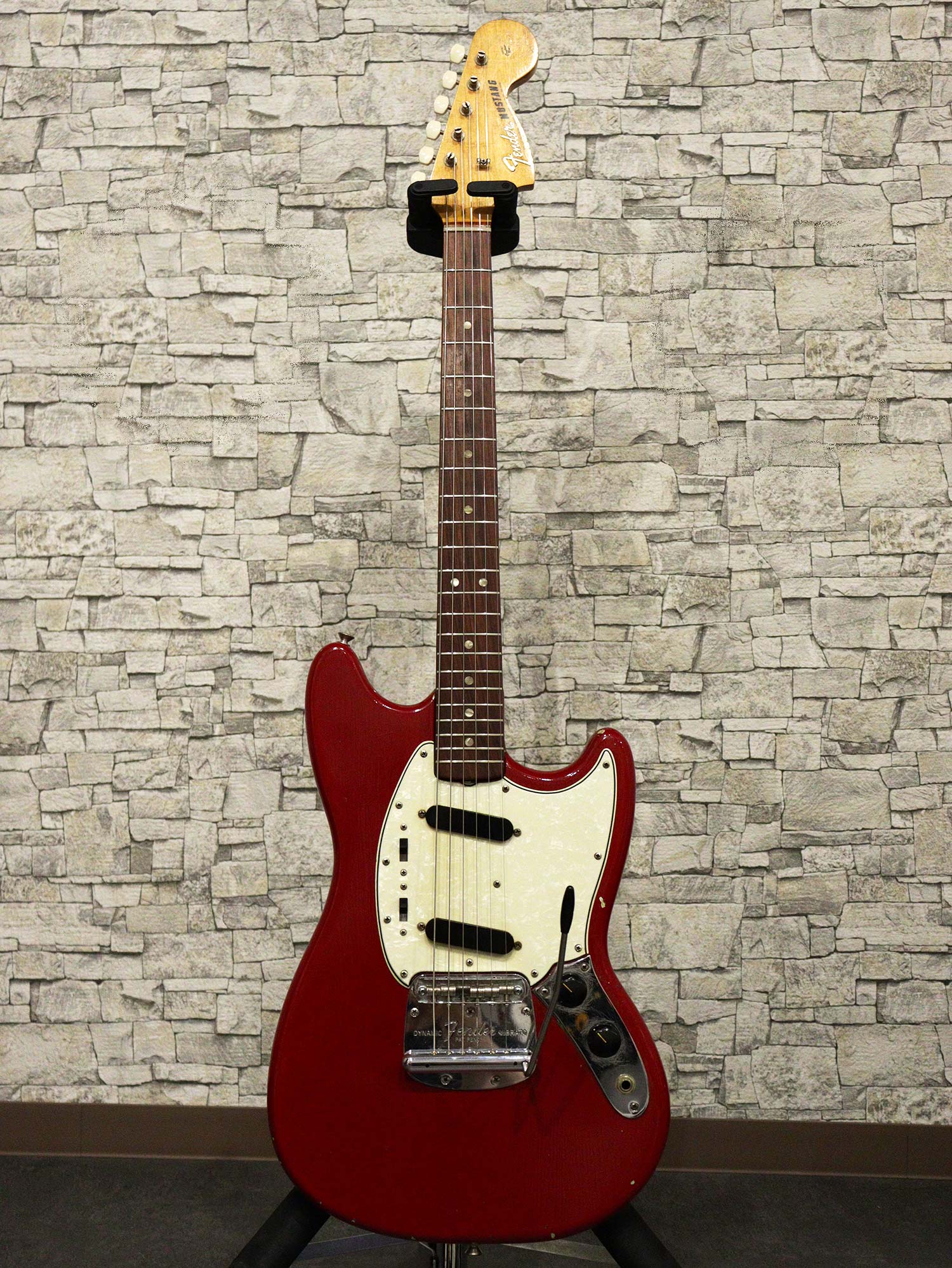 エレキギター/ベース/アンプの歴史を作ってきたギターブランドのひとつFenderより1964年にスチューデントモデルとして誕生した「Fender Mustang Red」1966年製中古品です。赤みの強い「Red」で仕上げられたボディ、指板ラディアス「7.25R」に22フレット仕様のラウンド貼りローズ指板、メイプルネックにショートスケールを採用。シングルピックアップ2基にそれぞれのON/OFFスイッチ、1Vol、1Toneながらフェイズサウンドも作り出せる仕様。