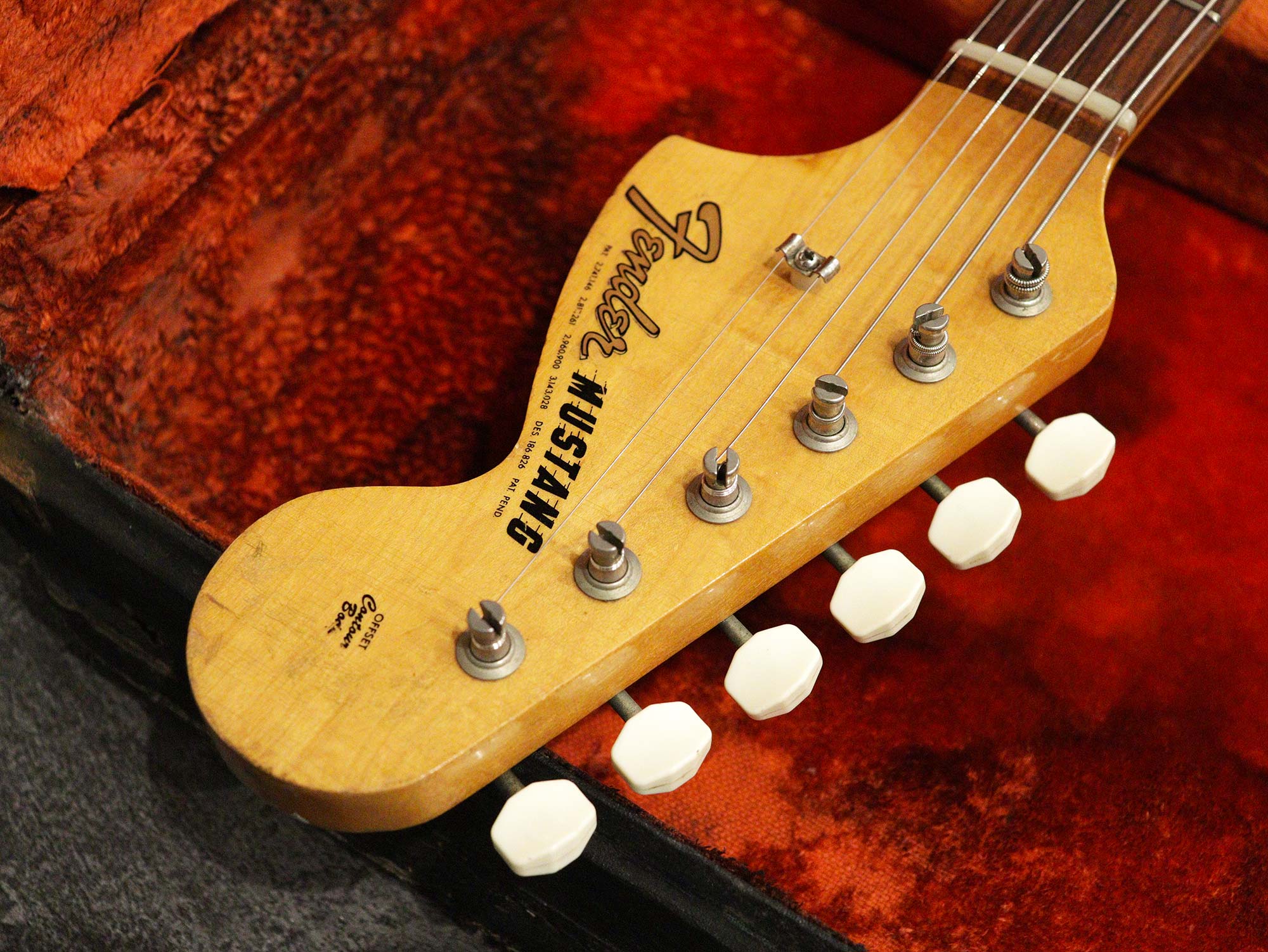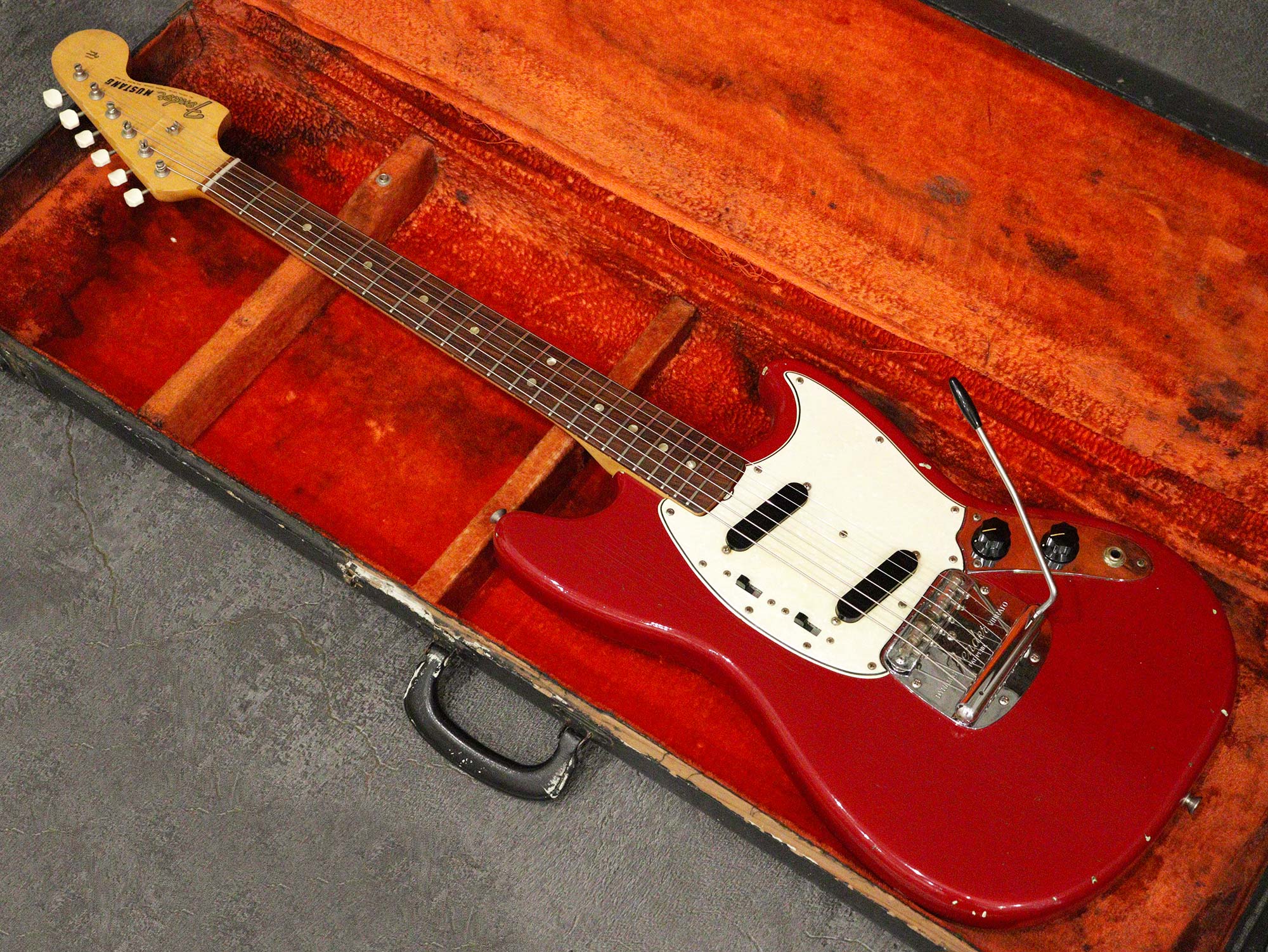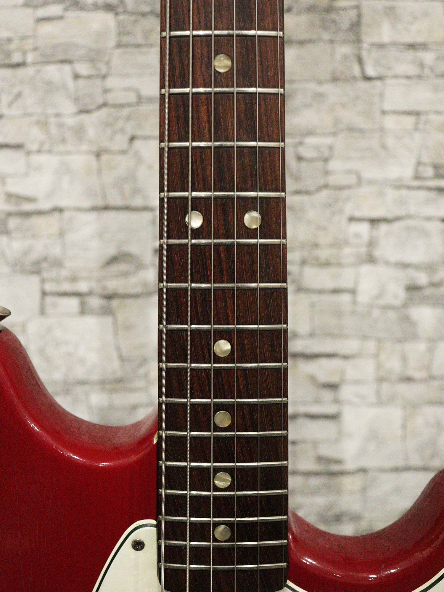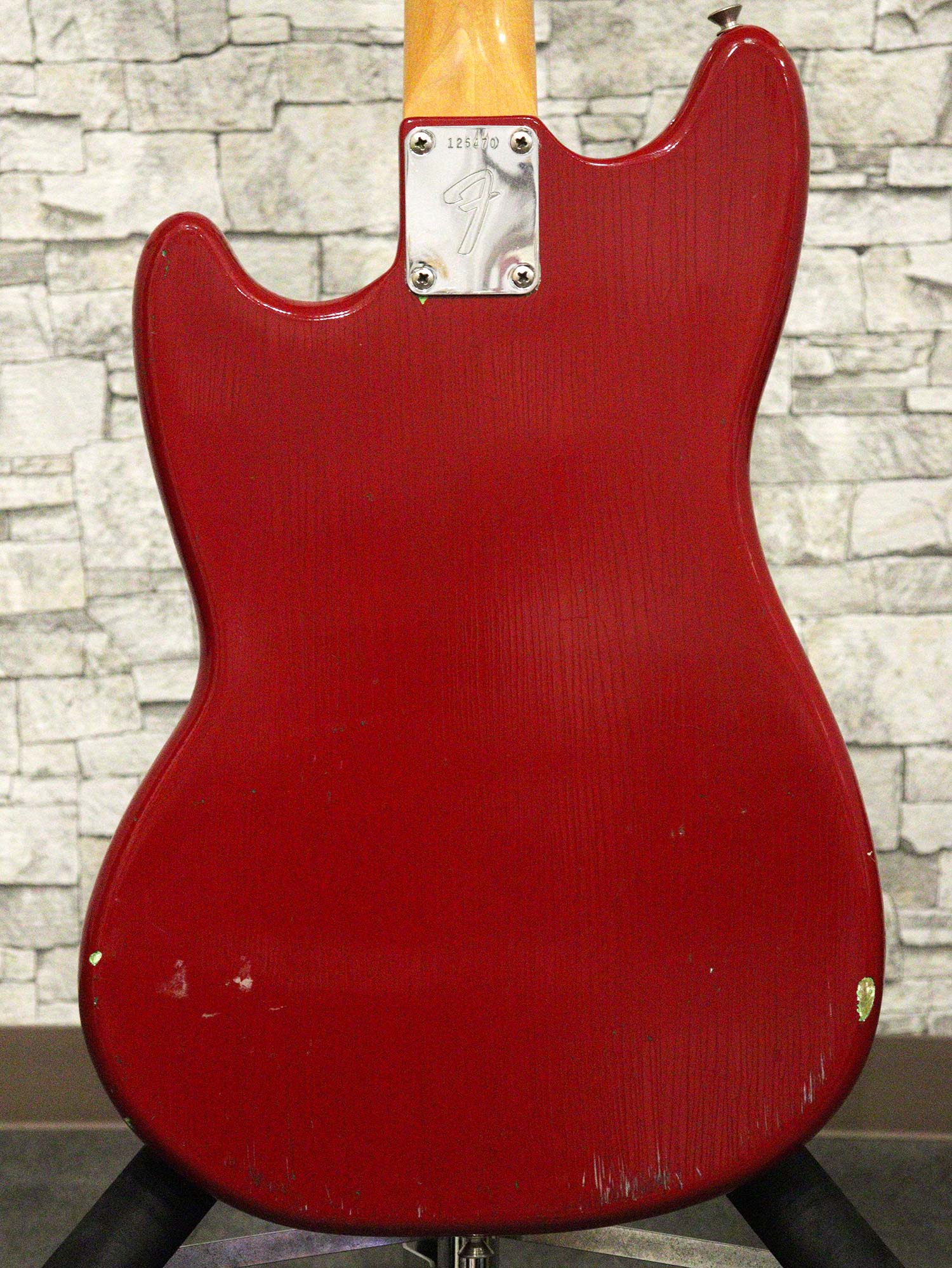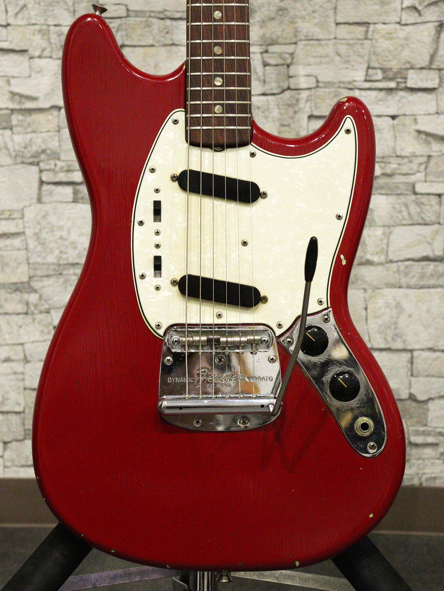 エレキギター/ベース/アンプの歴史を作ってきたギターブランドのひとつFenderより1964年にスチューデントモデルとして誕生した「Fender Mustang Red」1966年製中古品です。赤みの強い「Red」で仕上げられたボディ、指板ラディアス「7.25R」に22フレット仕様のラウンド貼りローズ指板、メイプルネックにショートスケールを採用。シングルピックアップ2基にそれぞれのON/OFFスイッチ、1Vol、1Toneながらフェイズサウンドも作り出せる仕様。