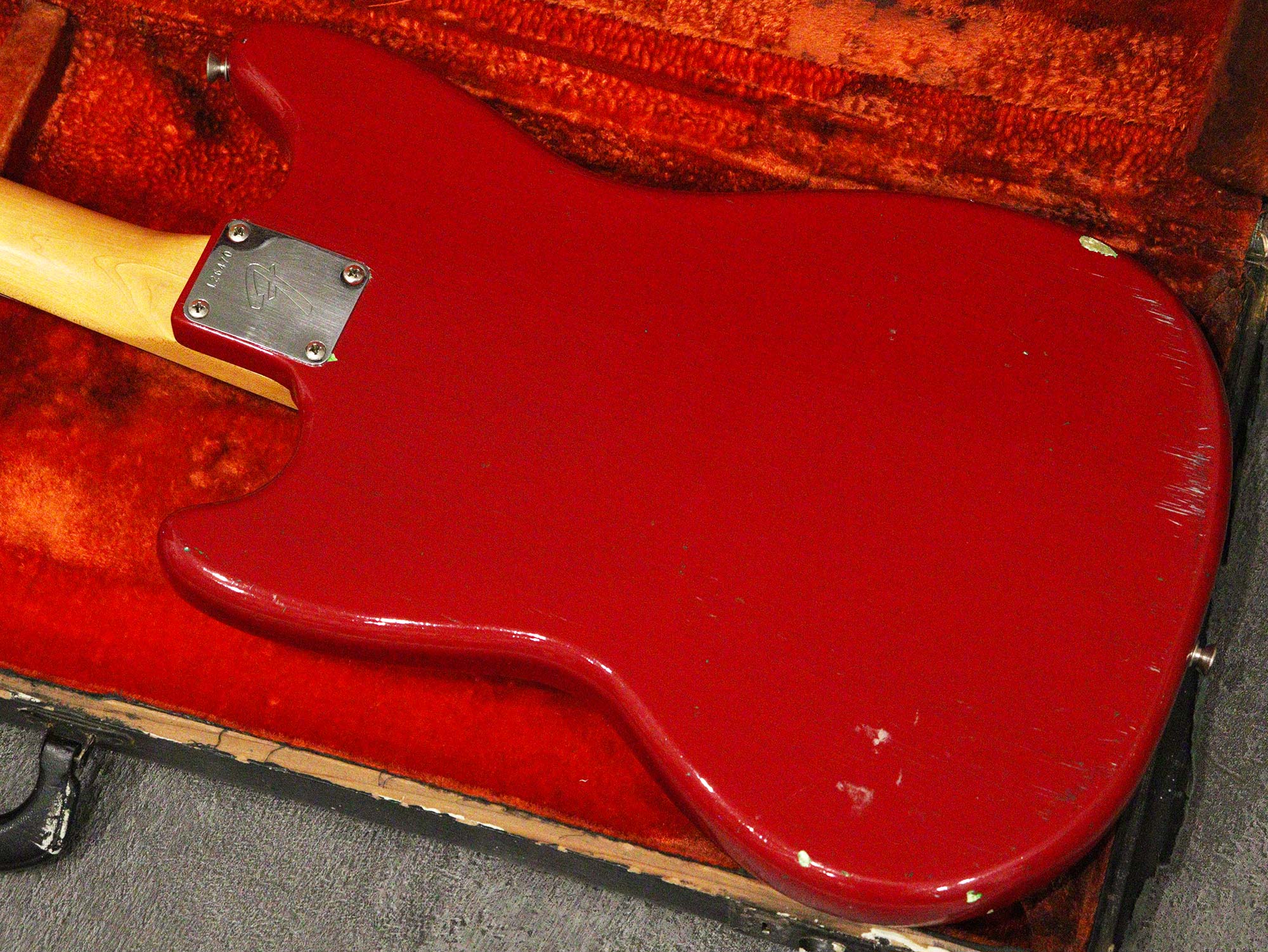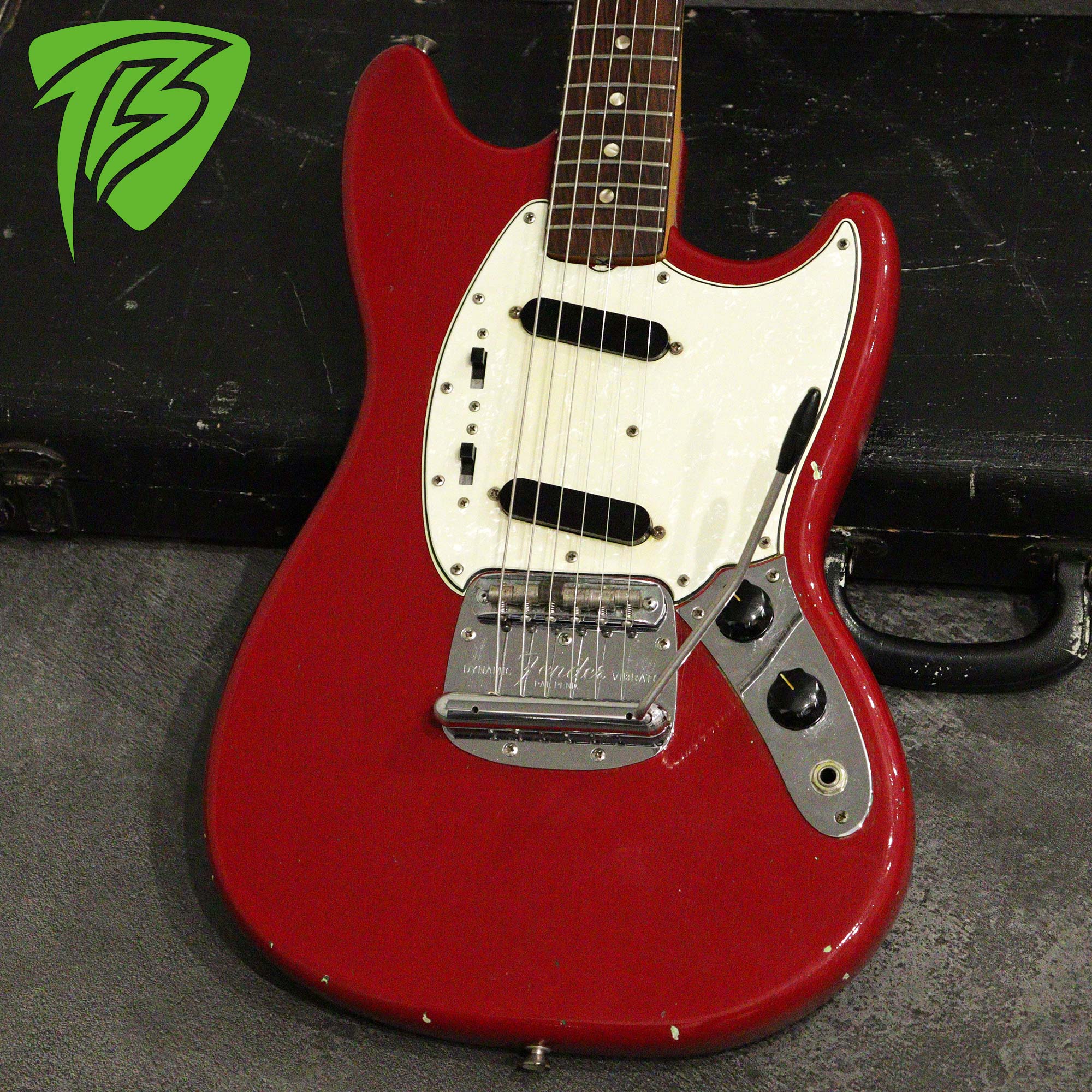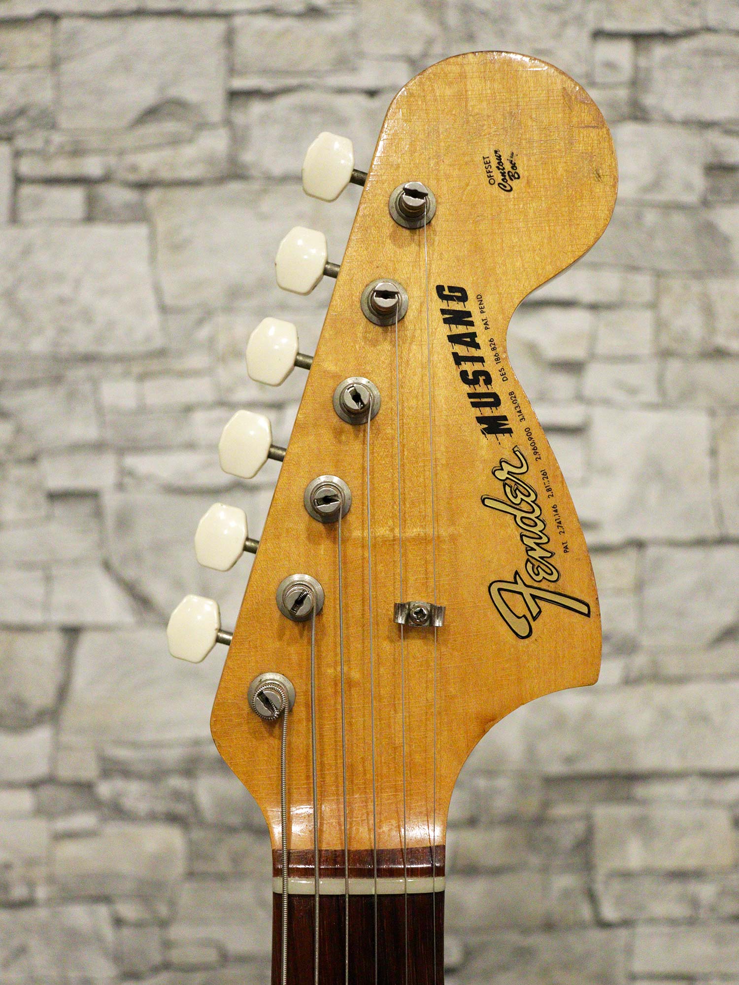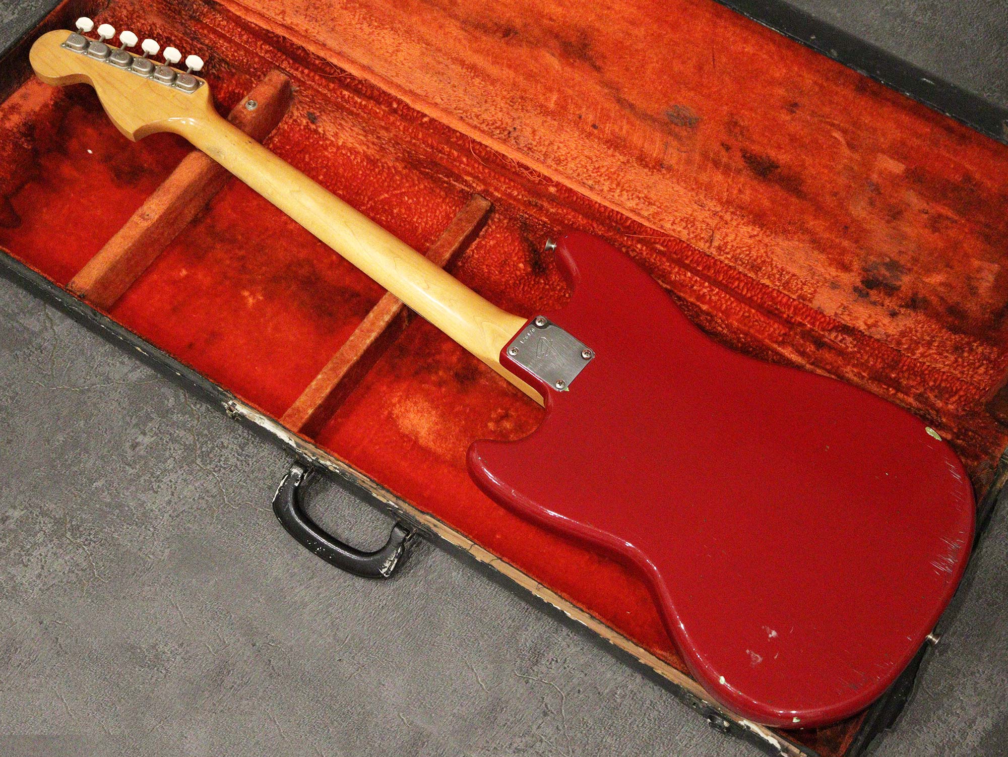 エレキギター/ベース/アンプの歴史を作ってきたギターブランドのひとつFenderより1964年にスチューデントモデルとして誕生した「Fender Mustang Red」1966年製中古品です。赤みの強い「Red」で仕上げられたボディ、指板ラディアス「7.25R」に22フレット仕様のラウンド貼りローズ指板、メイプルネックにショートスケールを採用。シングルピックアップ2基にそれぞれのON/OFFスイッチ、1Vol、1Toneながらフェイズサウンドも作り出せる仕様。