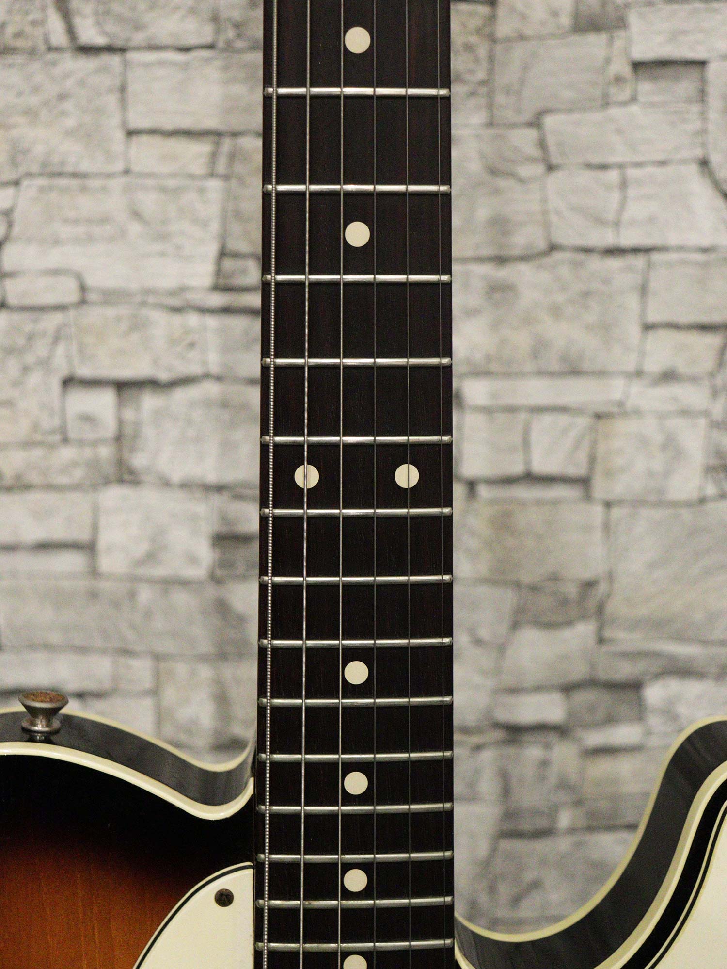 ネックはほぼストレートの丁度良い状態でトラスロッドは左右に余裕があり効きは良好、フレットはローポジションの減っている個所で6割、その他は全体的に7割キープで音がビリついたり詰まる箇所もなく、演奏性はとてもよいコンディションを保っております。