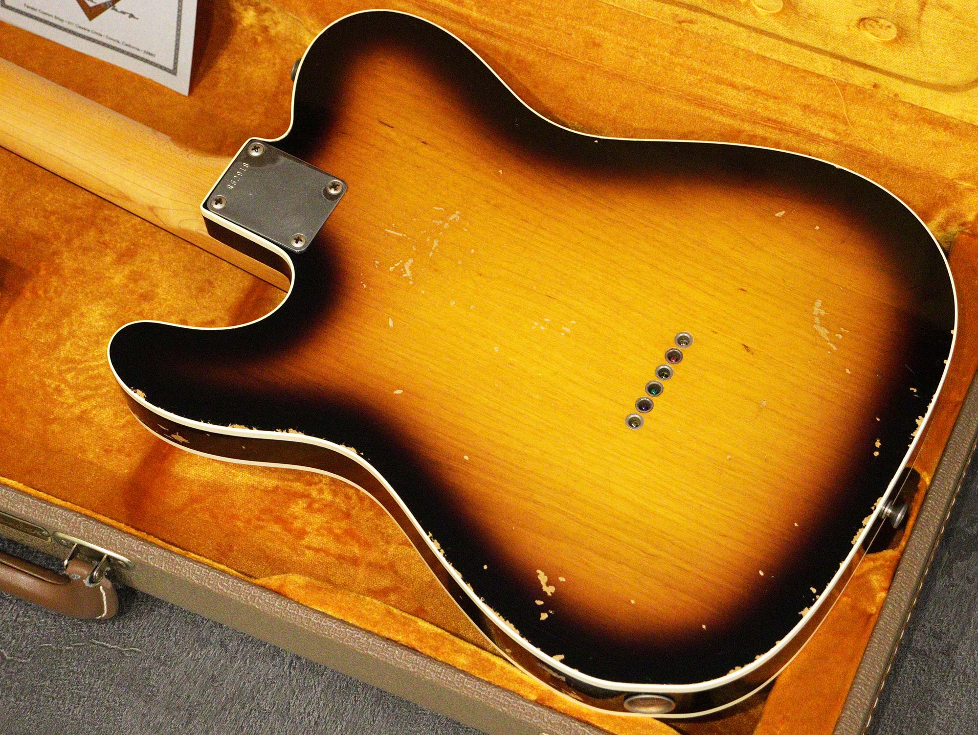 レリック加工、ボディにバインディングが施され「Faded 3Tone Sunburst」カラーで仕上げられたアッシュボディ、ミディアムフレットに指板ラディアス「9.5R」のスラブ貼りローズ指板、クォーターソーンメイプルネック。オリジナルピックアップはピックアップビルダー「アビゲイル・イバラ」の"abby"サイン入り、3wayセレクター、1Vol、1Toneのコントロール。