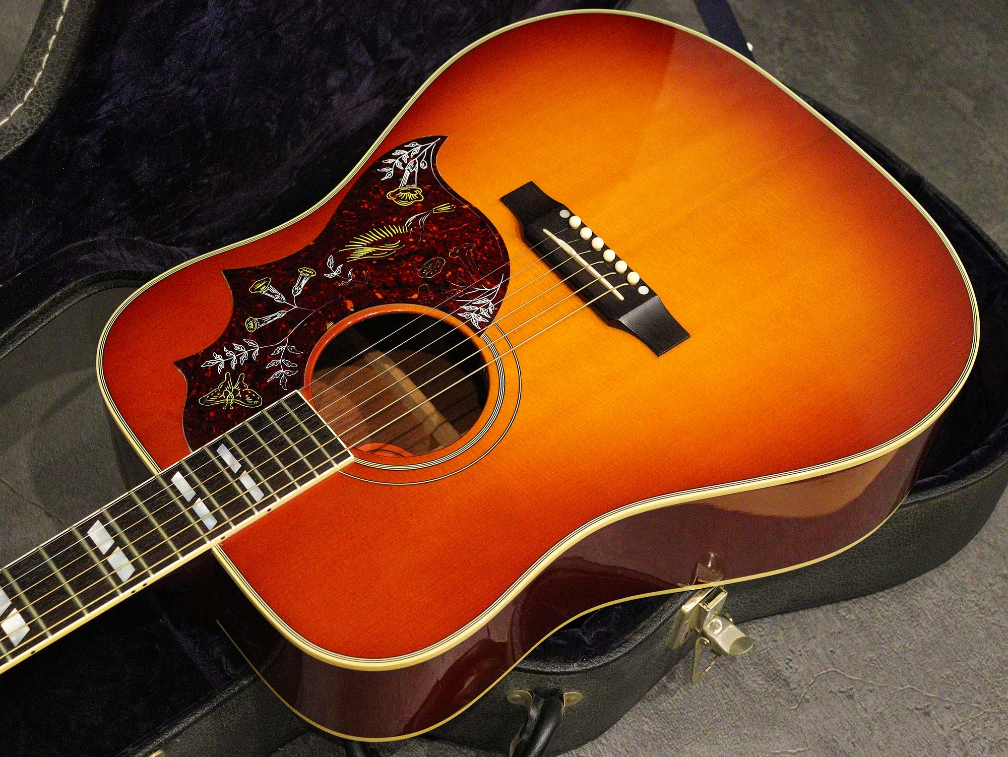Gibsonアコースティックギターモデルの中でも「J-45」と並んで人気のモデル「Gibson Hummingbird Heritage Cherry Sunburst with Fishman Ellipse VT」の2000年製中古品です。ハチドリが描かれた特徴的なピックガードに「Heritage Cherry Sunburst」カラーで仕上げられたスプルースTop&マホガニーSide/Backのスクエアショルダーボディ、マホガニーネック、ダブルパラレログラムインレイが施されたローズ指板、ローズウッドブリッジ、ゴールドタイプのGroverペグ、ピックアップシステム「Fishman Ellipse VT」が後から取付されておりブリッジ裏にアルミテープが貼られ弦アースが取られております。