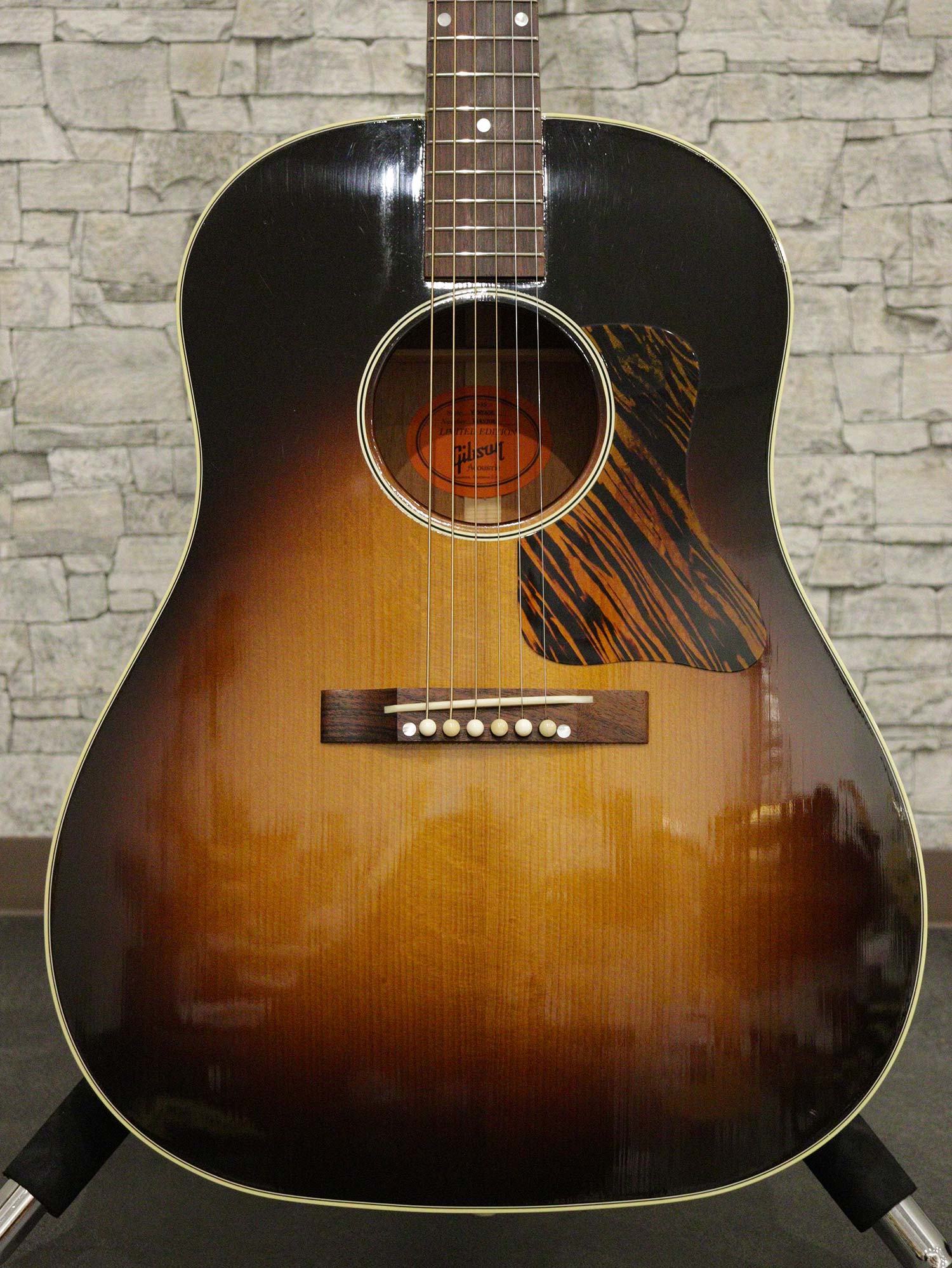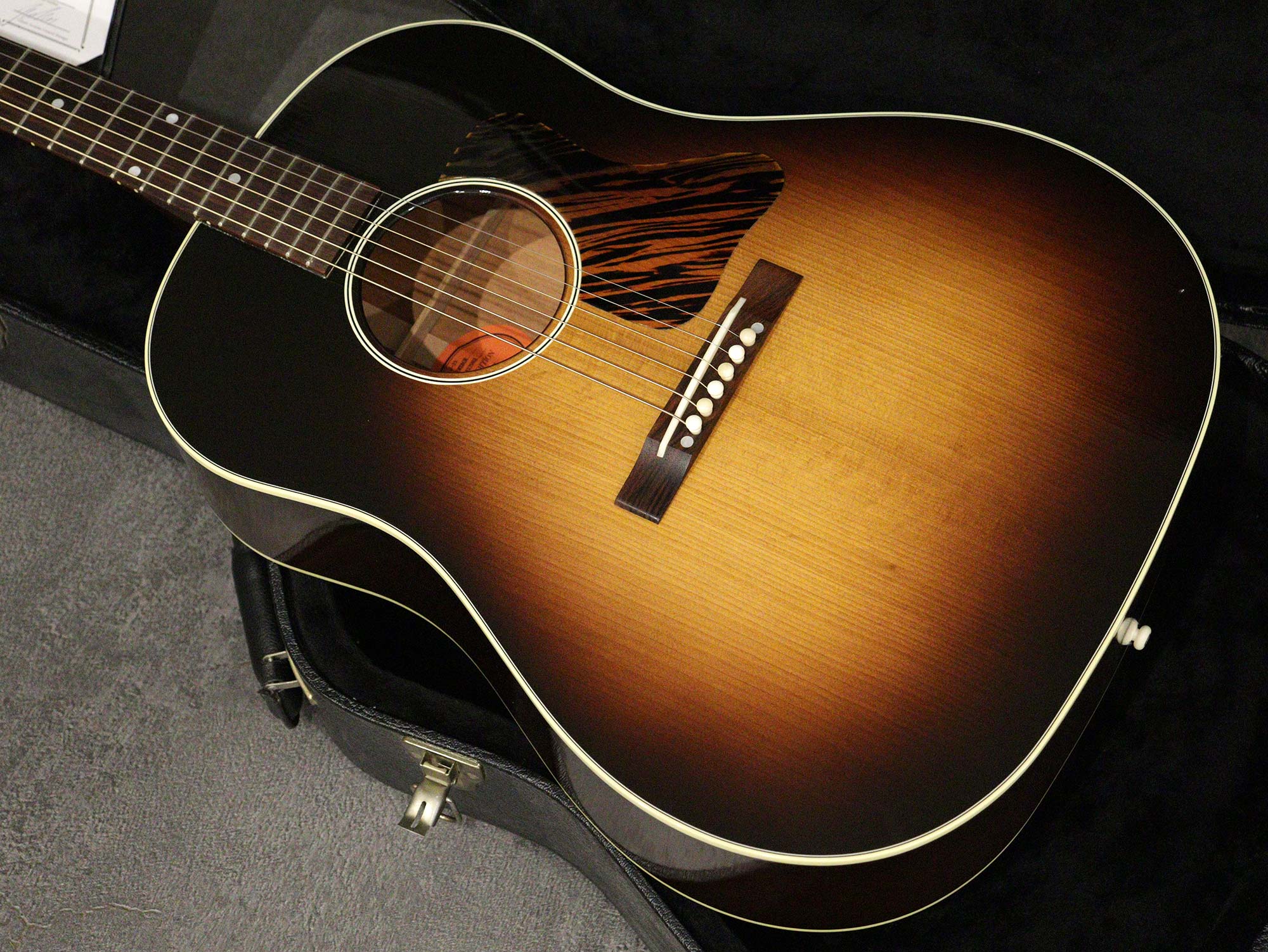 ギブソンアコースティックギターの大定番モデル「J-45」の前身として1936年-1943年まで製造されたオリジナル「J-35」を再現したリミテッドモデル「Gibson J-35 Vintage Collector's Edition」2017年製の中古品です。サーマリーエイジドされたアディロンダックスプルースTop、マホガニーSide/Backのラウンドショルダーボディ、ナット幅44.0mm(実測値)のマホガニーネック、ローズウッド指板、オープンバック/メタルノブのGroverペグ、レクタングル(長方形)のローズウッドブリッジとロングサドル、ファイヤーストライプ柄のピックガード。