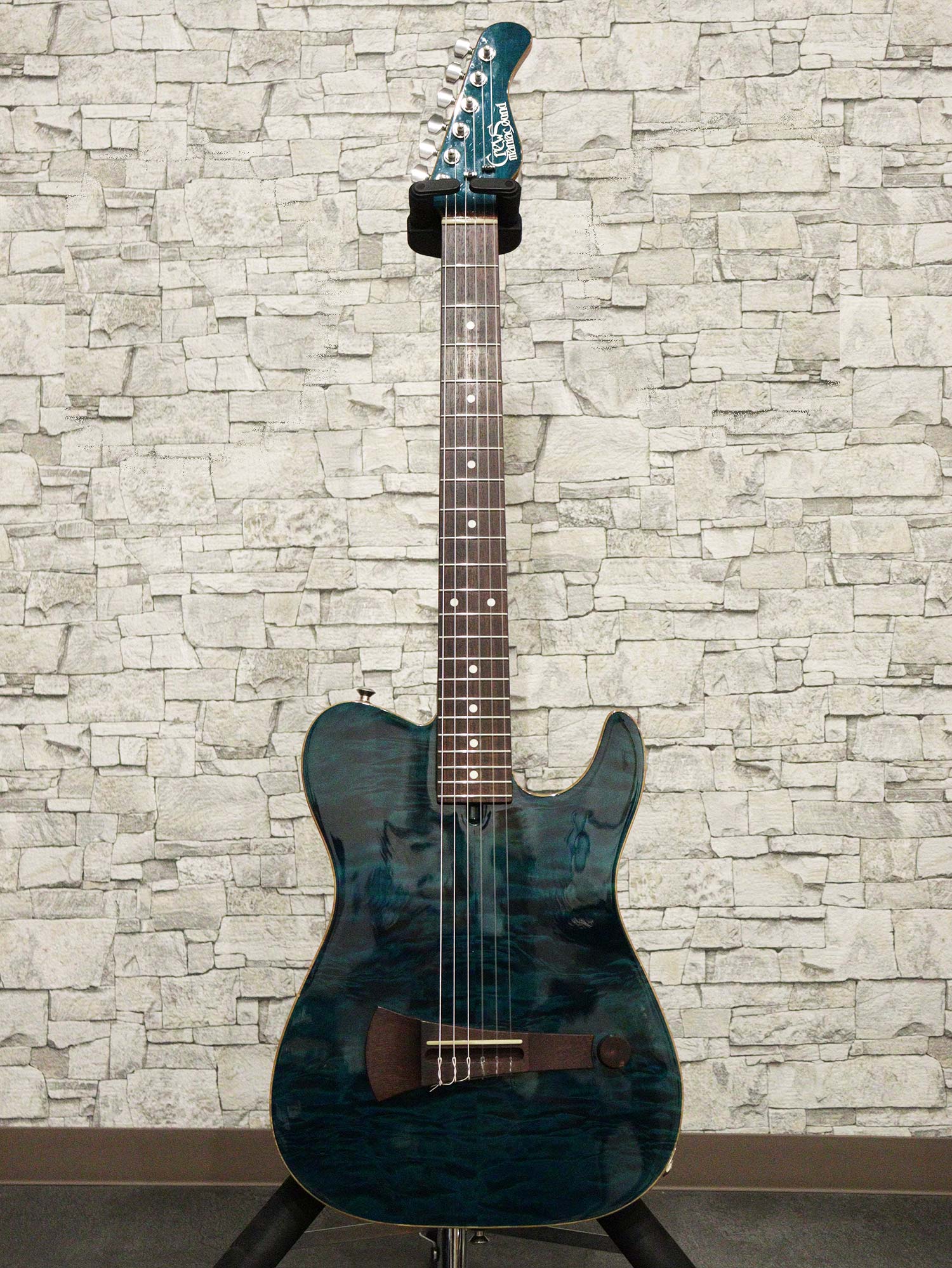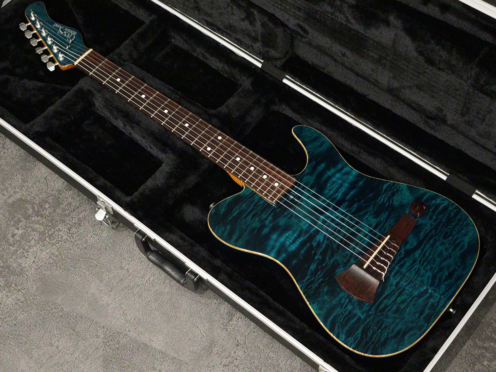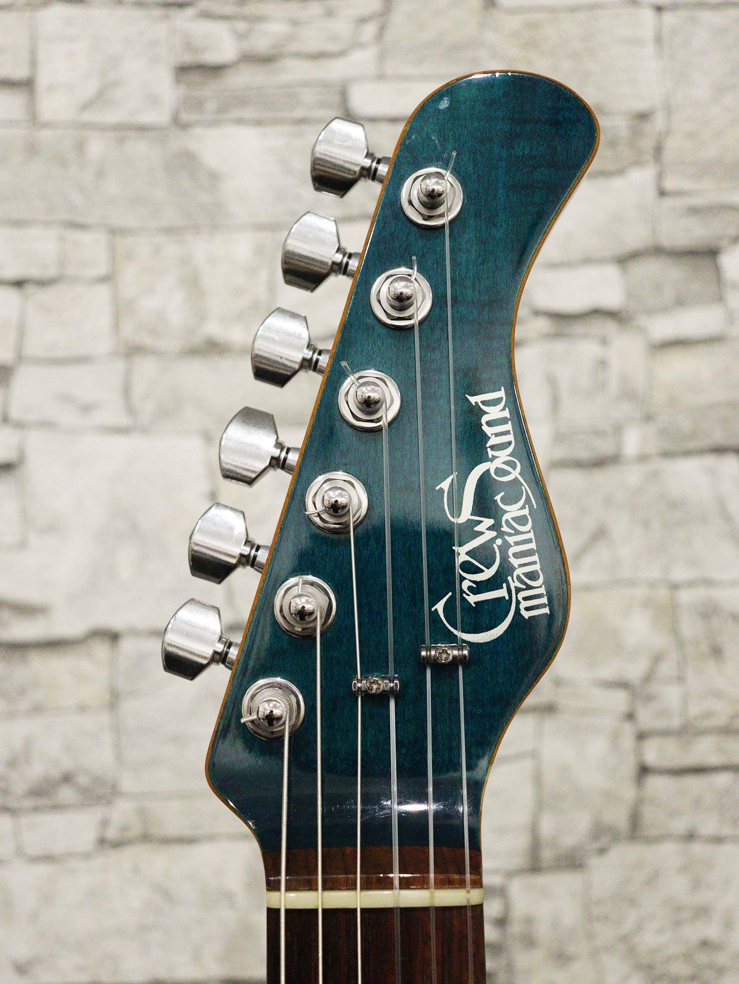 長野県の飛鳥工場(ディバイザー)と愛知県の寺田楽器で生産され、技術力の高さで知られる国内メーカー"クルーズ"のエレガットモデル「Crews Maniac Sound SM-Gut Quilt Maple Top See Through Blue」の中古品です。鮮やかな「See Through Blue」で仕上げられたキルトメイプルトップ/ホロウ加工されたアルダーバック、46mmのナット幅を持つローズ指板、クールなマッチングヘッド仕様のメイプルネック。ヴォリュームのみのシンプルなコントロールでバックパネル内にクルーズオリジナルのプリアンプを搭載。