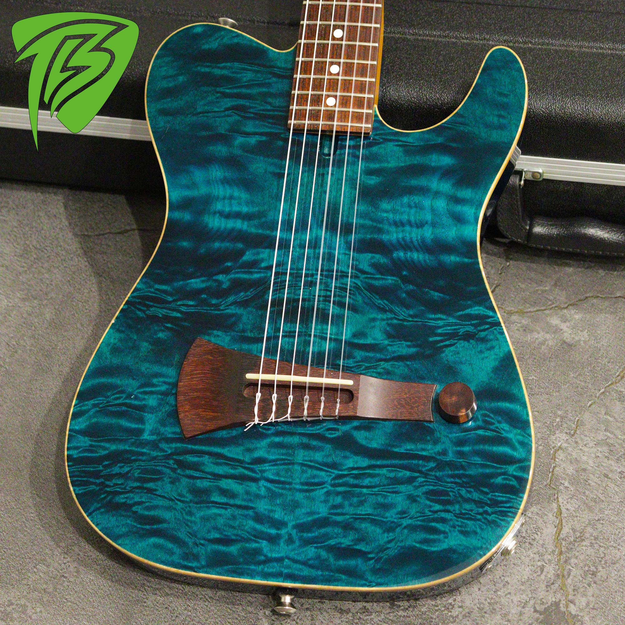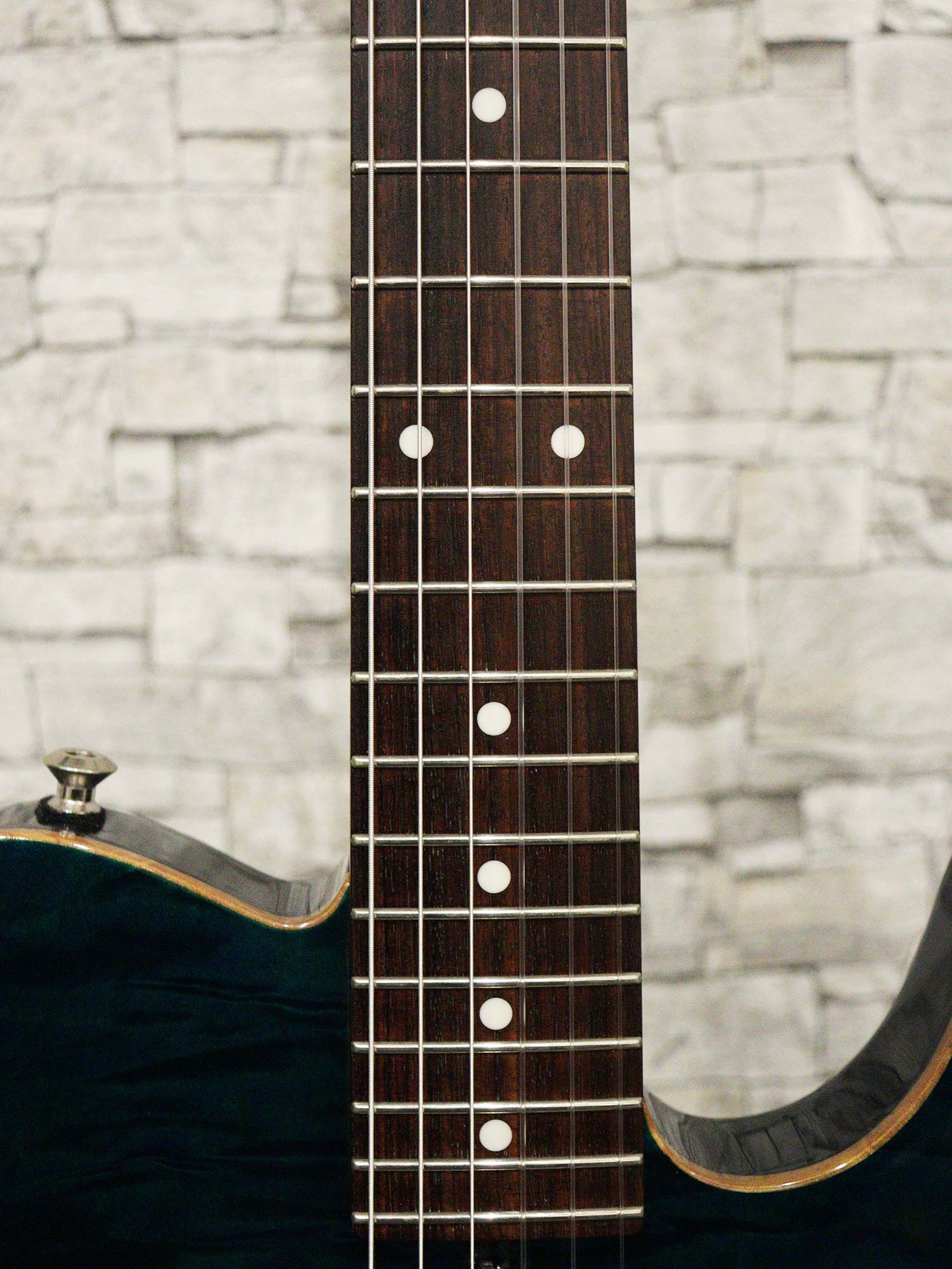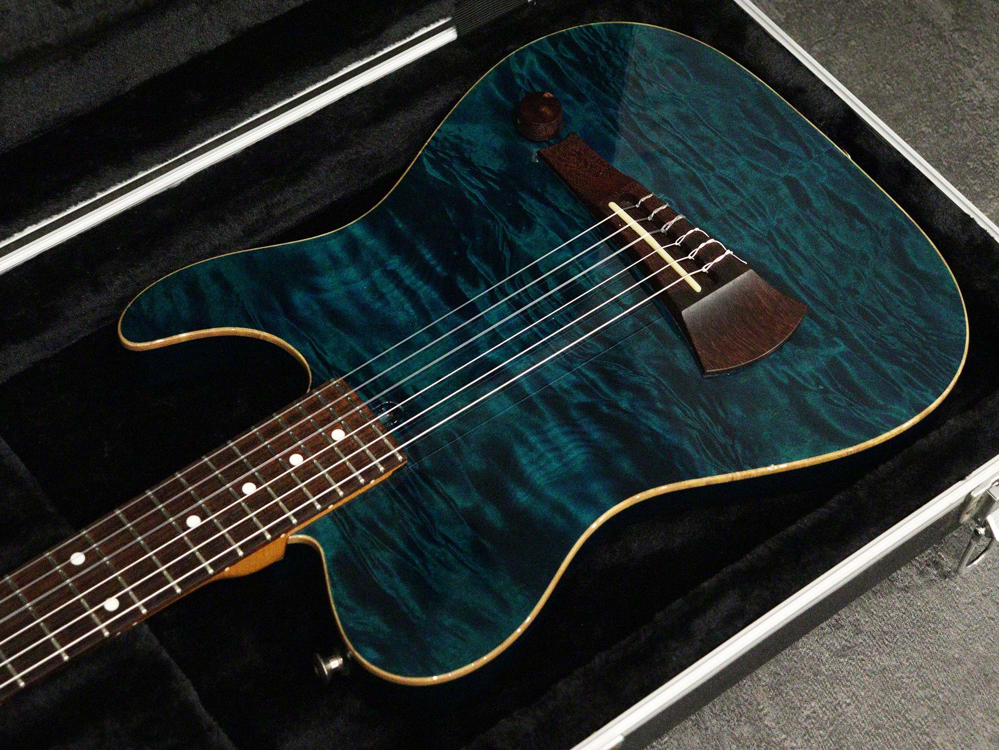 長野県の飛鳥工場(ディバイザー)と愛知県の寺田楽器で生産され、技術力の高さで知られる国内メーカー"クルーズ"のエレガットモデル「Crews Maniac Sound SM-Gut Quilt Maple Top See Through Blue」の中古品です。鮮やかな「See Through Blue」で仕上げられたキルトメイプルトップ/ホロウ加工されたアルダーバック、46mmのナット幅を持つローズ指板、クールなマッチングヘッド仕様のメイプルネック。ヴォリュームのみのシンプルなコントロールでバックパネル内にクルーズオリジナルのプリアンプを搭載。