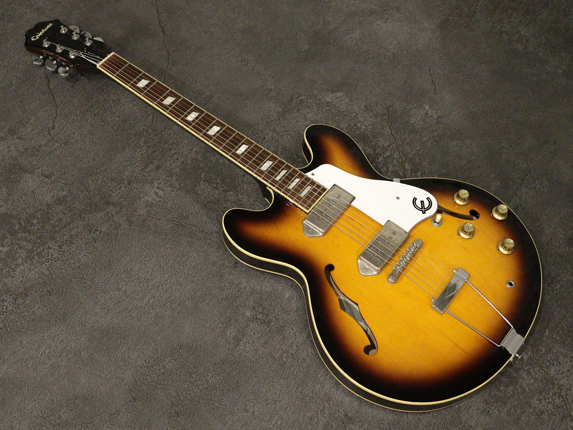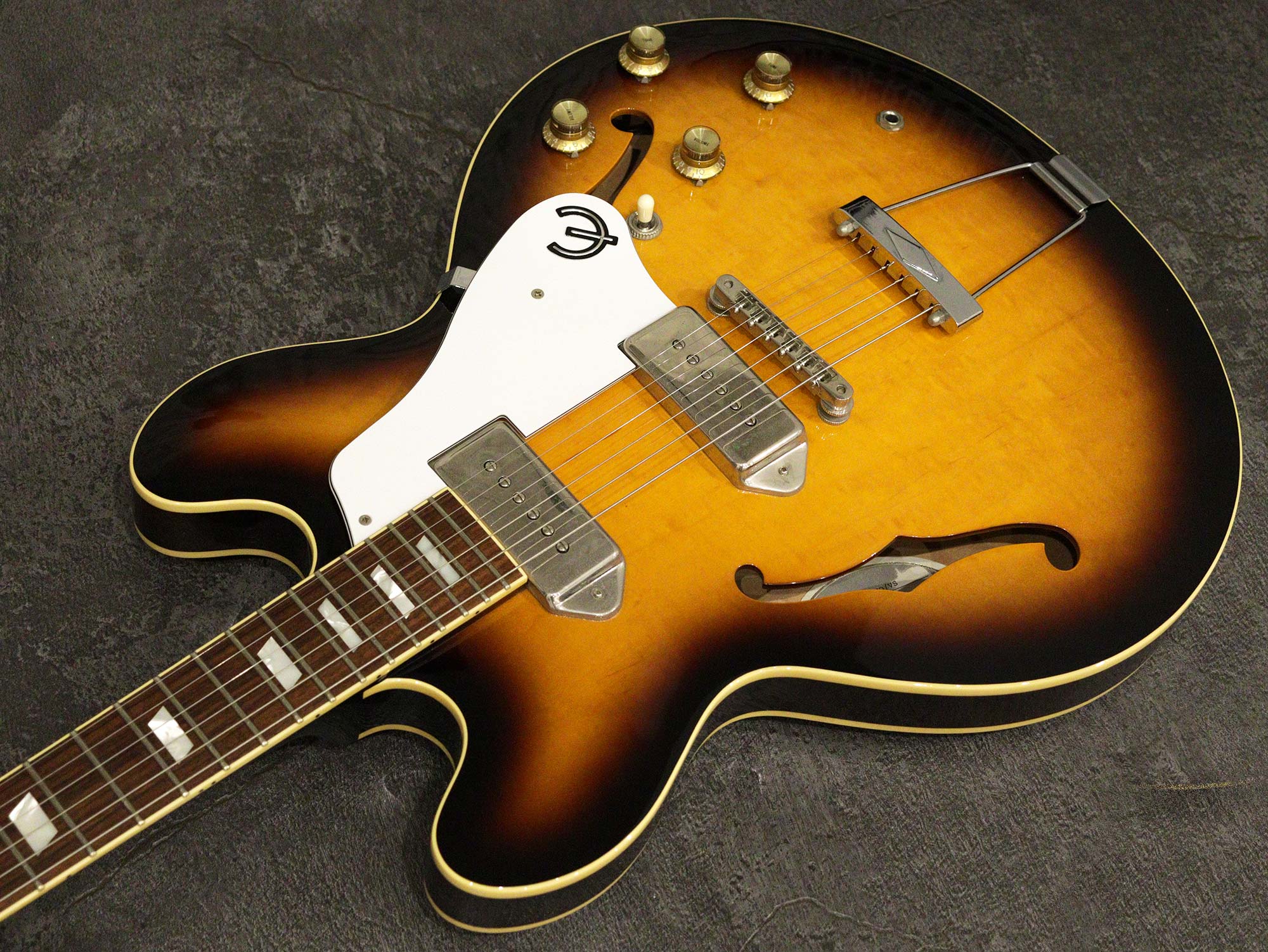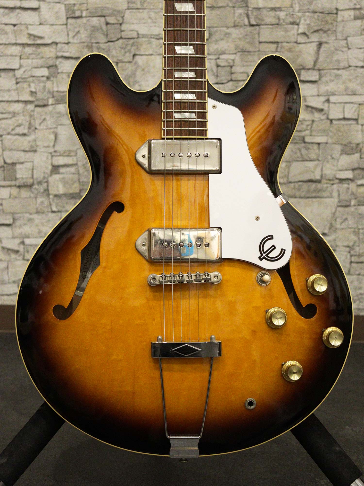 高い再現度とクオリティを誇る寺田楽器製 Elitistモデル「Epiphone Elitist 1965 Casino Vintage Sunburst」の2010年製中古品です。「Vintage Sunburst」カラーで仕上げられたフルアコ構造のメイプルボディ、ローズ指板、マホガニーネック。ピックアップはオリジナルUSA製「EP-90」を搭載、3wayトグルスイッチ、2Vol、2Toneの定番のコントロール。