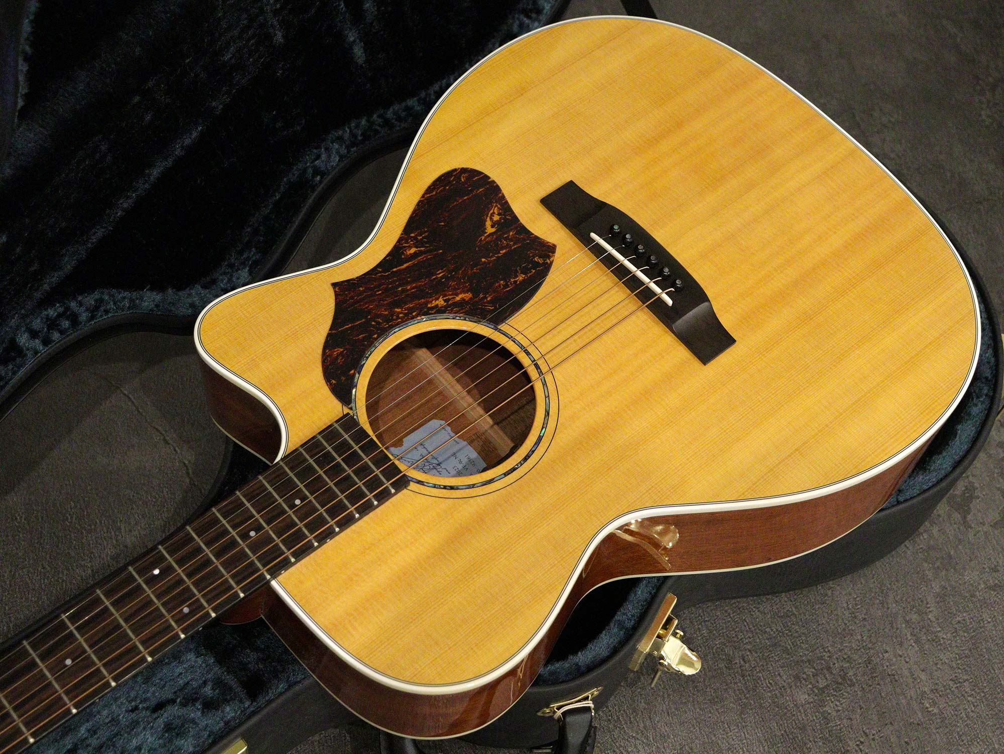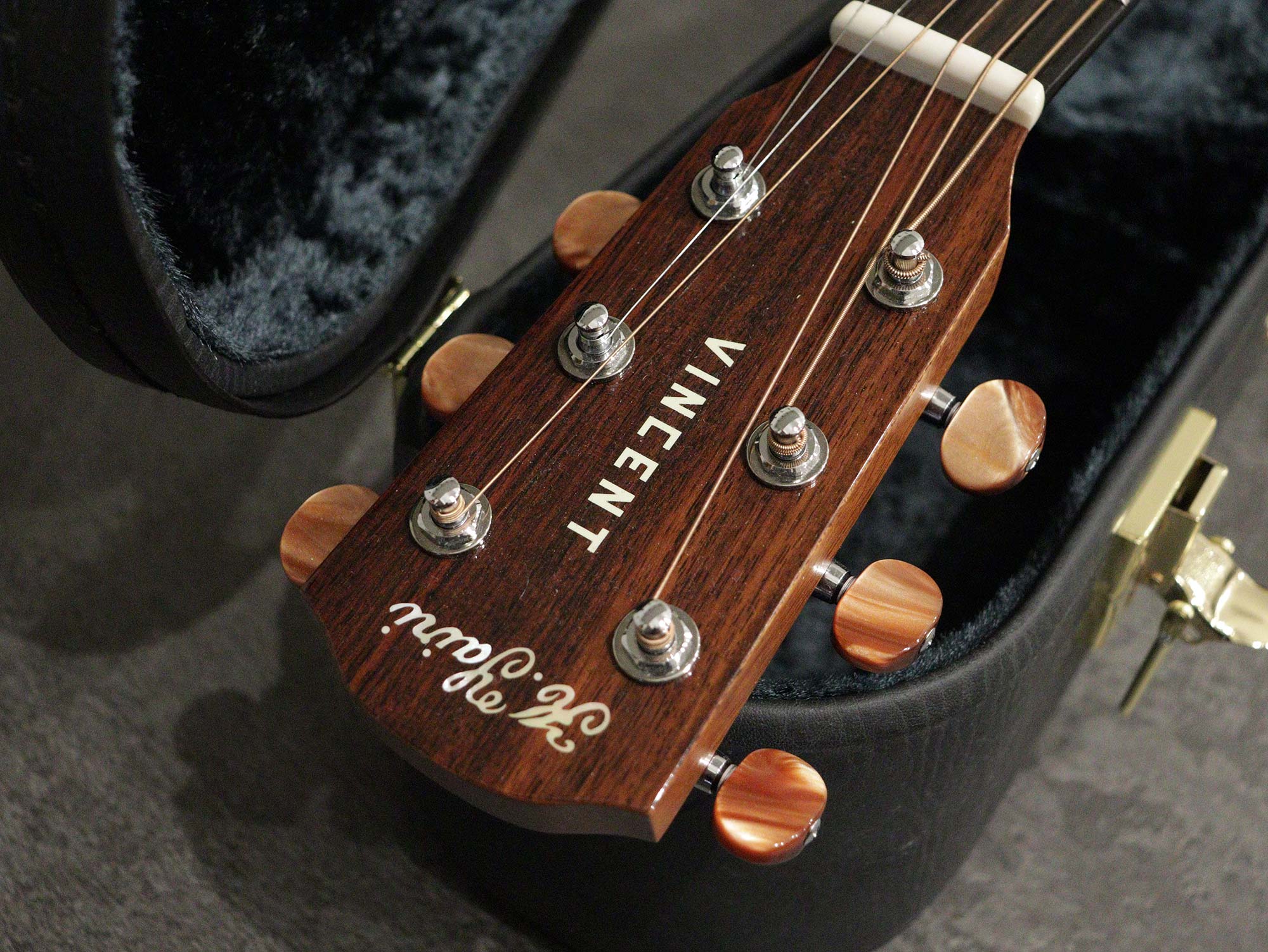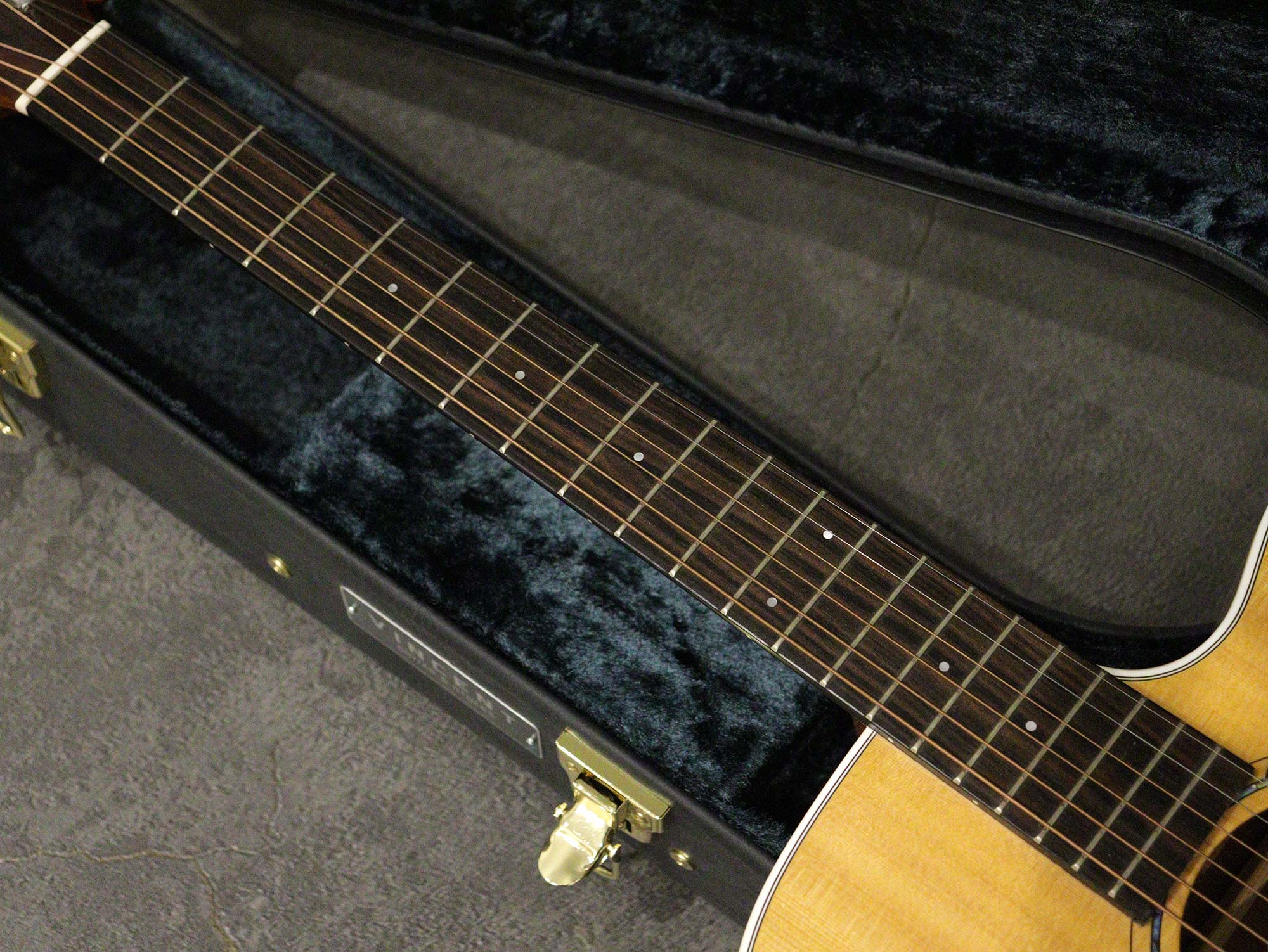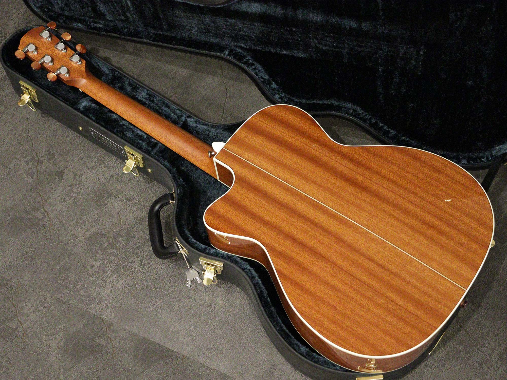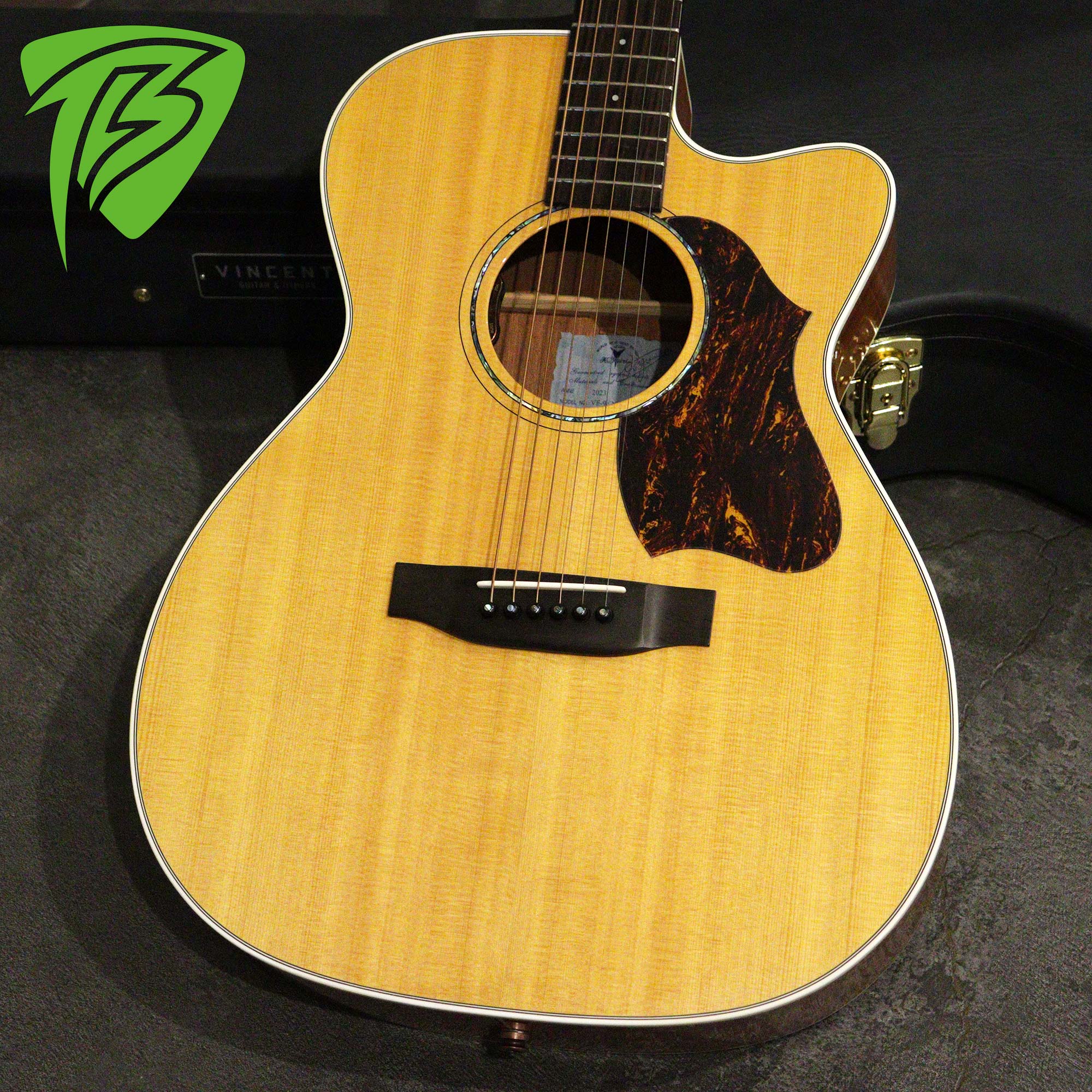 製作はヤイリギターに委任し、製品開発・製作監修・製品PR・最終調整、そして販売に専念したブランドVINCENTによるカッタウェイモデル「K.Yairi VINCENT VF-9c NL」2023年製の中古品です。VFと呼ばれるトリプルオーサイズのカッタウェイボディを持ち、トップはスプルース単板、サイド&バックはマホガニー合板、ブリッジ&指板はエボニー、マホガニーネック。ナット幅は42mm、スケールは645mmを採用。またピエゾピックアップ「L.R.Baggs ELEMENT VTC」を搭載。