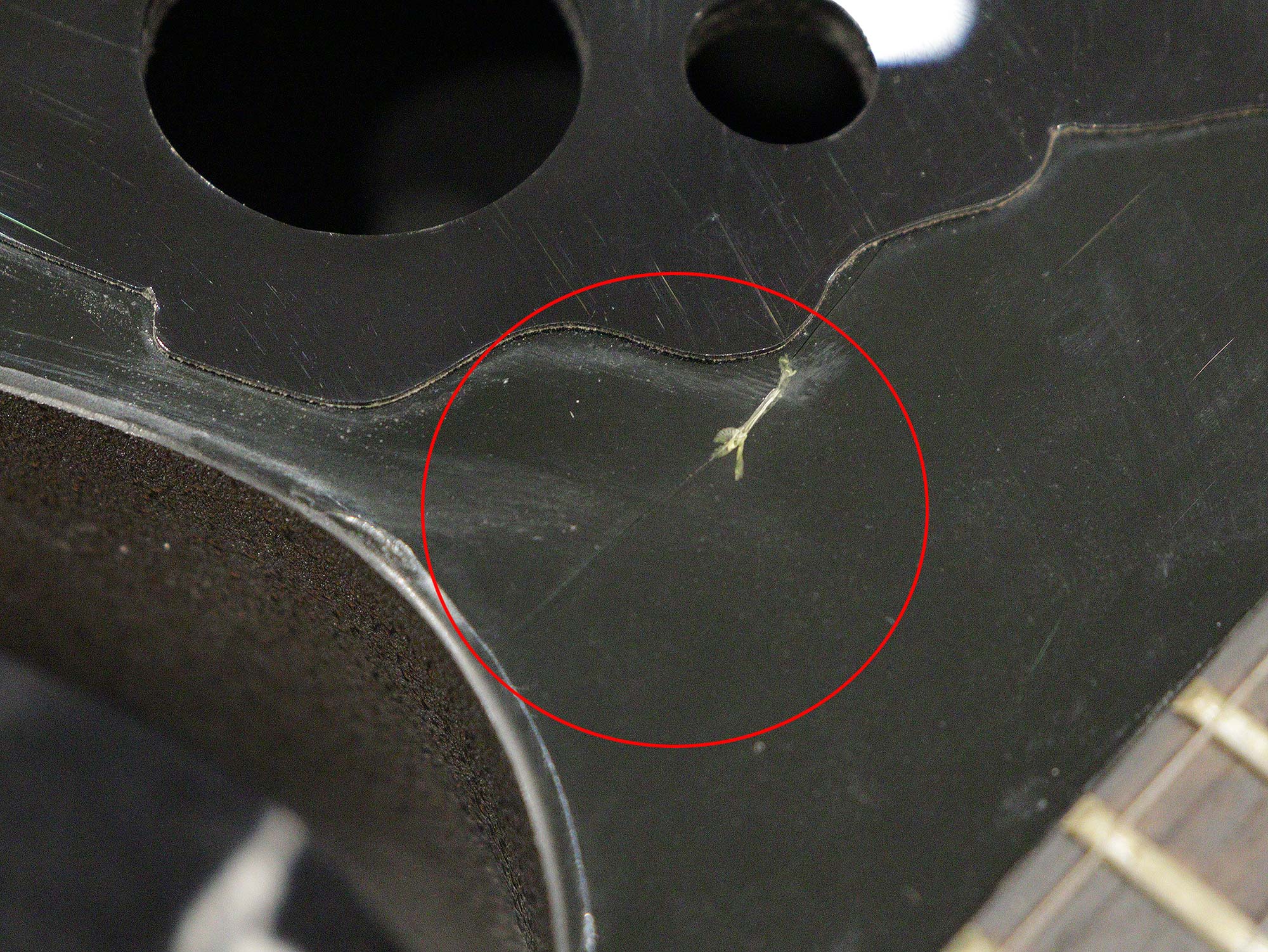 使用感、弾きキズ/スリキズが見られ、1弦側エポレット付近に塗装のヒビ割れが見られますが木部の割れまでは達しておりません。