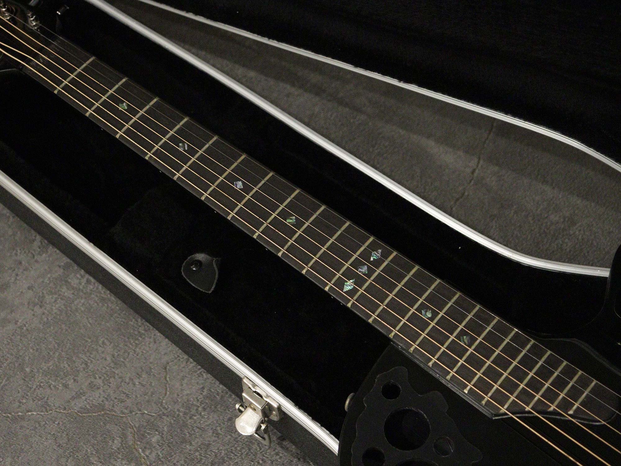 トラスロッドは7割ほどの締まり具合ながら効きは良好、ネックは現在4弦側若干の順反り、1弦側ほぼストレートの若干のネジレ状態。弦高は12フレット上で6弦側 約2.5mm、1弦側 約2.2mm、フレットは全体的に8割残りで現状ビビリや音詰まりもなく演奏性に問題はございません。