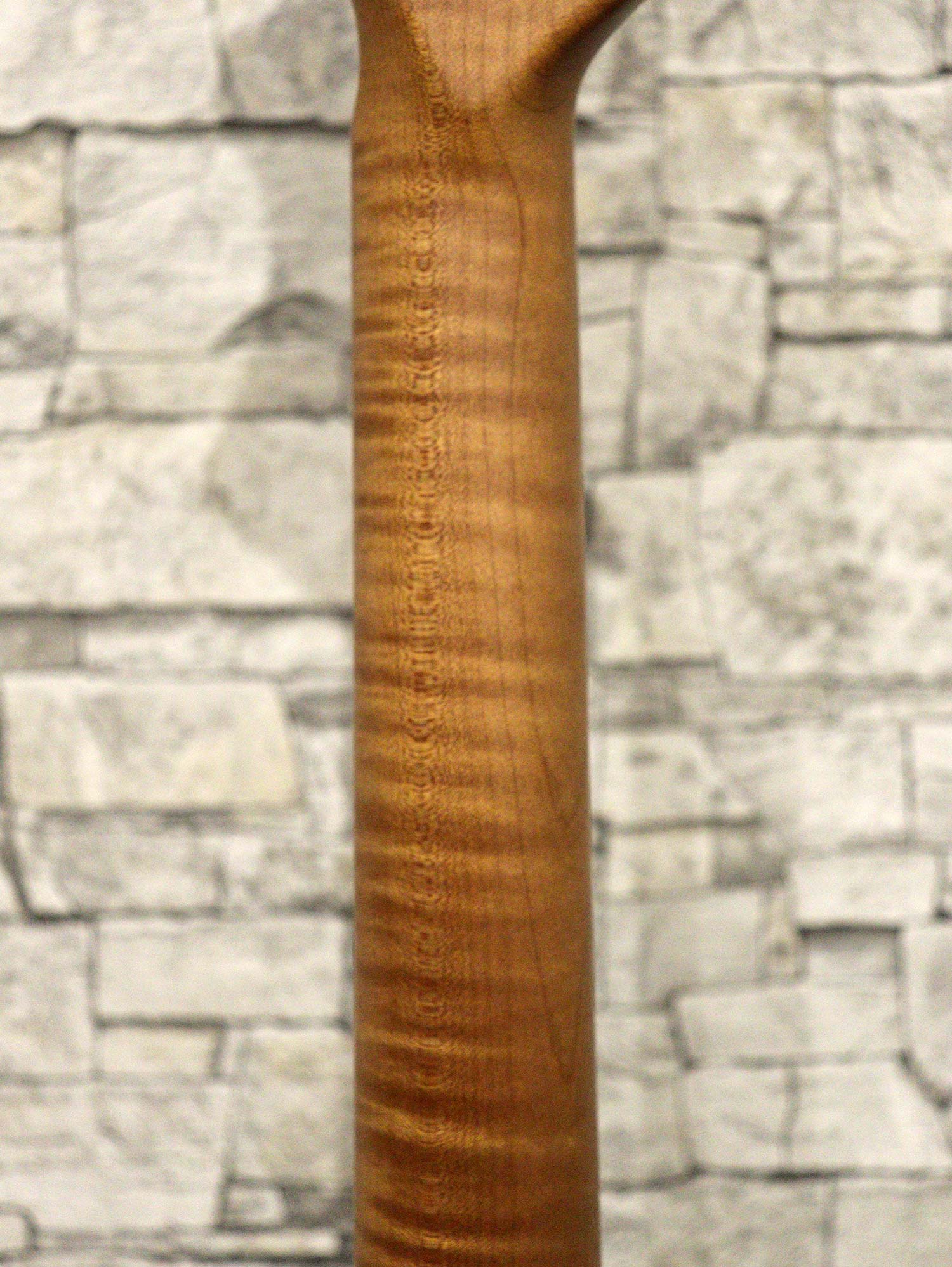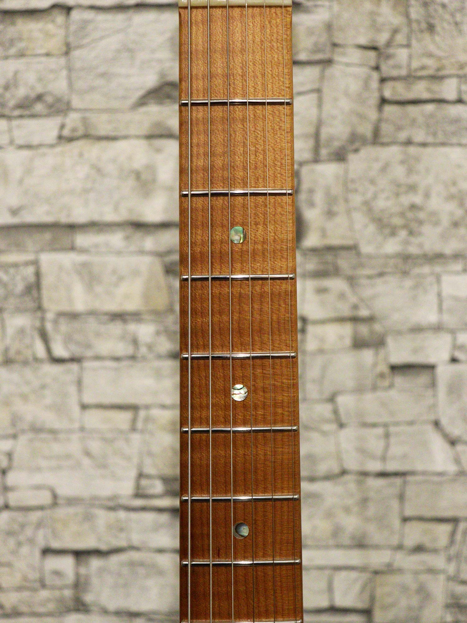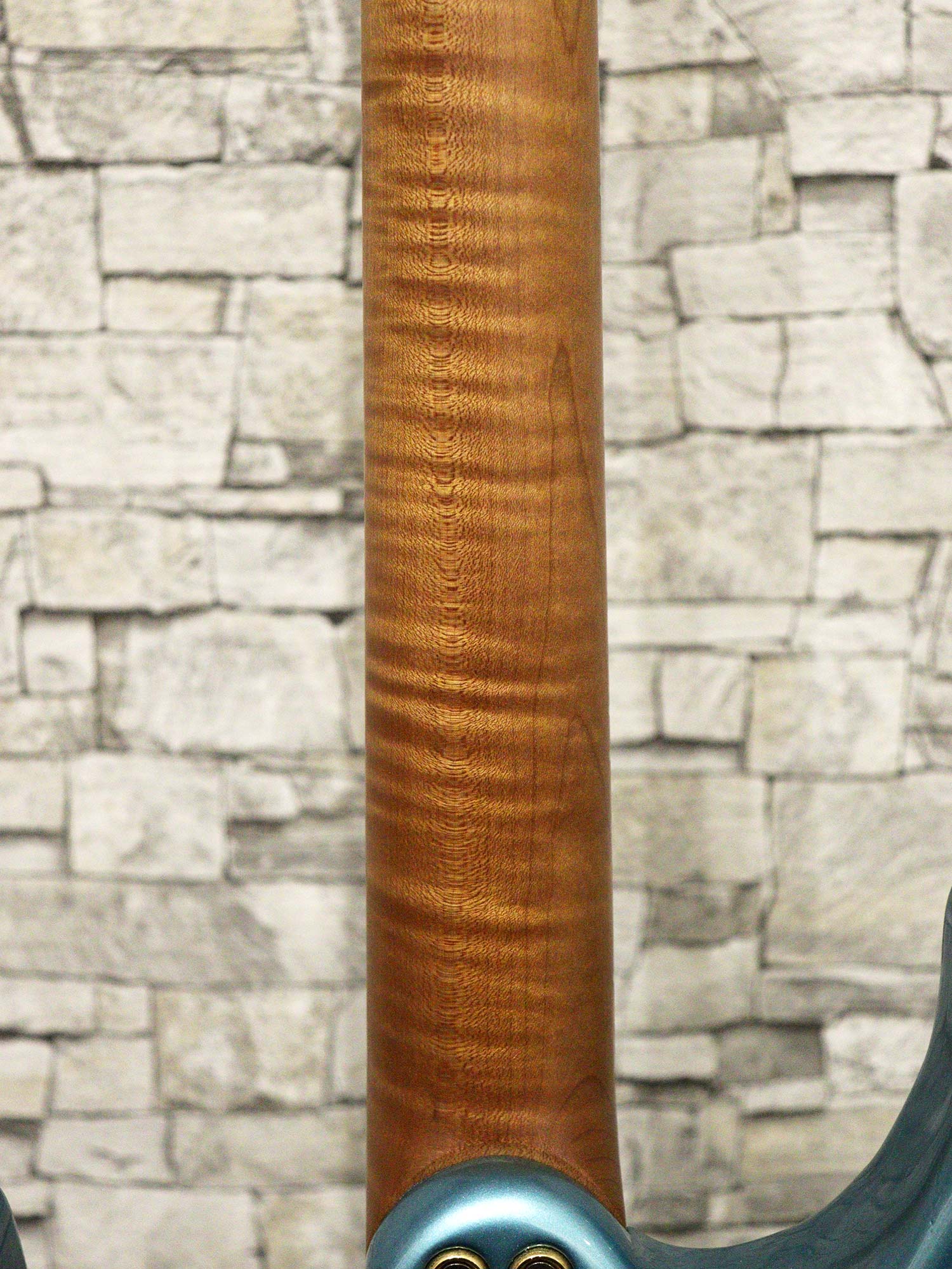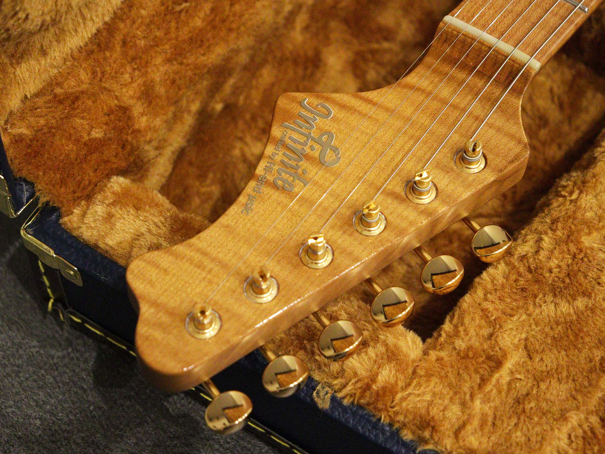 大阪にて小規模な工房ながらメーカーのOEMやリペアを行ってきたハイエンドミュージックによるオリジナルブランド「infinite Full Size ST 1P Swamp Ash Roasted Flame Maple Ice Metallic Blue」の中古品です導管が分かるほど薄く吹かれた「Ice Metallic Blue」で仕上げられた1Pスワンプアッシュボディ、ステンレスフレットのモダンな「10-14インチ」コンパウンドラディアスを採用した「Roasted Flame Maple」指板、クセはないものの比較的しっかりとしたグリップ感の「Mid C」シェイプの「Roasted Flame Maple」ネック。ピックアップは「Bare Knuckle Pickups Apache Single Coil Set」を搭載、コントロールは5wayセレクター、1Vol、1Toneながら本来のセンタートーンの位置にあるノブはブレンダーとなっており、フロント・リアいずれかのポジションの際にノブを絞るとシリーズ接続でセンターピックアップがMixされ、ハーフトーンの位置の際に絞った場合、絞るにつれてセンターPUのみが出力されるようになる特殊な回路となっております。